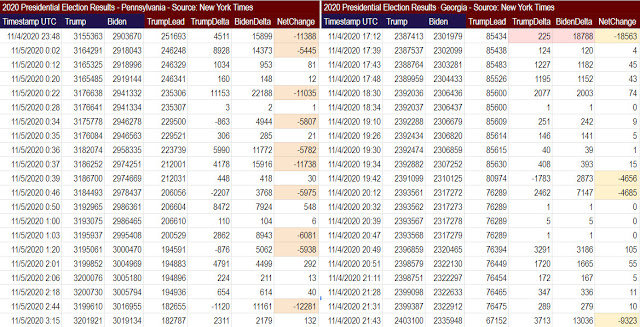 Below are excerpts of spreadsheets that show what was happening on the right side of each chart. Vote flips in the same-sized bundles (6,000 in PA and 4,800 in GA) were injected into the system to overcome Trump’s lead in both states. You can click either image above to see all of the data.