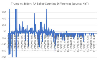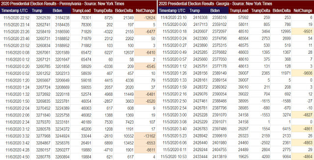 Note the vote flips, represented by the highlighted cells, that occurred in both PA and GA. In PA, late vote flips in bundles of around 6,000 were clear anomalies to slowly overcome Trump’s lead. In GA, the bundles were in 4,800 vote swaps.