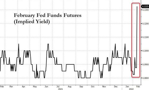 Why is this notable? Because the February contract expires on Feb 28, more than two weeks before the March 16 FOMC decision. This means that someone is preparing for an intermeeting rate hike, some time before March. And plugging in the numbers, the 13bps in the Feb contract means that there is now a 30% chance of an emergency rate hike.