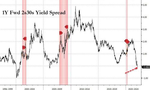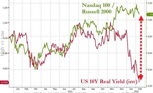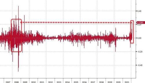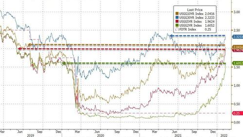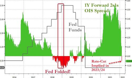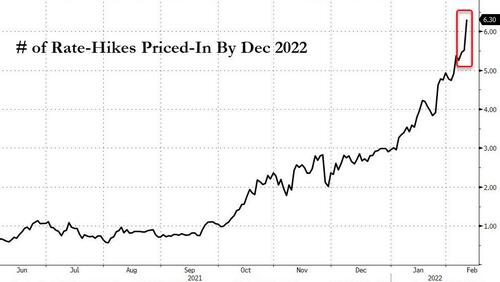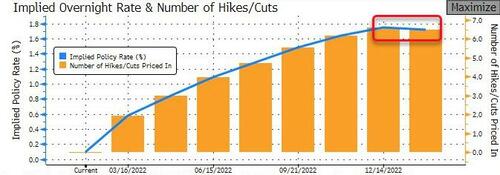With the punditry obsessing over the March FOMC meeting, where odds earlier today hit 100% of a 50bps rate hike before easing modestly (and more than 6 hikes for all of 2022)…