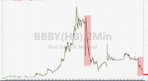 As we detailed overnight, after soaring 130% at its highs of the day, bankrupt-ish Bed Bath & Beyond (having already missed interest payments on its bonds) just pulled a Hertz, announcing its plan to offer series A convertible preferred stock and warrants, raising over $1 billion.