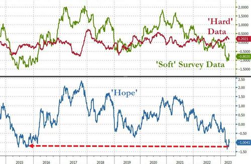 All of which leaves ‘soft’ survey data dismally low relative to ‘hard’ data expectations – which is also starting to fade…