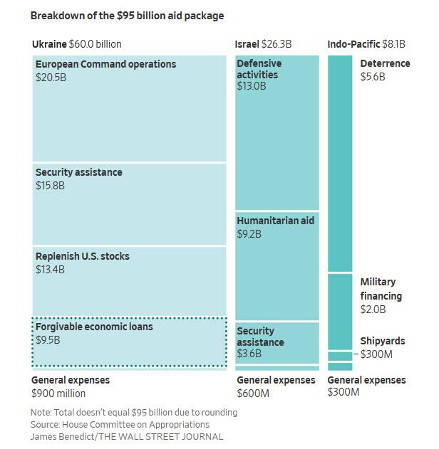 As broken down below, the measure contains money for Ukraine, Israel and Taiwan, as well as humanitarian aid for Gaza—largely matching an earlier Senate bill—plus additions made by the House, such as sanctions on Russia and Iran and the TikTok provision. Leaders in the GOP-controlled House also changed roughly $9.5 billion in economic aid to Ukraine into forgivable loans rather than grants, to make it more politically palatable to Republicans, as if Ukraine will ever repay anything.