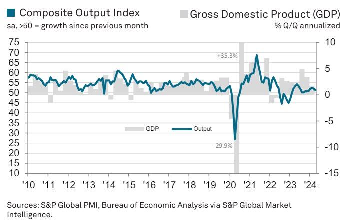 “Service sector growth slowed in April to point to a sluggish start to the second quarter for the US economy. Alongside a concomitant cooling in the rate of growth of manufacturing output, the weaker service sector performance means overall business activity grew in April at the slowest rate seen so far this year. At current levels, the PMI indicates that GDP is expanding at a modest annualized rate of approximately 1.5% so far in the second quarter.