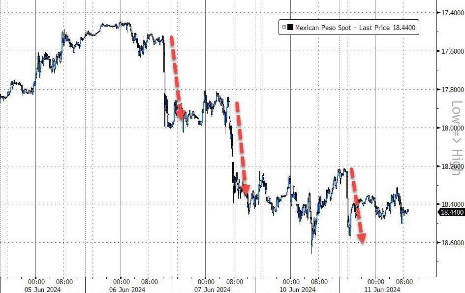 | Repercussions from the stunning EU Parliamentary Elections appeared again on Tuesday. French centre-right leader Ciotti calls for pact with far right in surprise move Eric Ciotti, the leader of French moderate conservatives Les Republicains, is seeking to save his party from a likely painful defeat in the 30 June and 7 July snap French parliamentary elections. Yet, his decision might split it in half… Ciotti, the president of the EPP-affiliated party, said to the French channel TF1 that his party has to create “an alliance with the National Rally (Le Pen), with its candidates, and all of those people that share the ideas of the right.”… https://www.euronews.com/2024/06/11/french-centre-right-leader-ciotti-calls-for-pact-with-far-right-in-surprise-move Le Maire Warns of French Debt Crisis If Le Pen’s Party Wins Vote (due to tax cuts) – BBG Finance Minister Bruno Le Maire warned that France would be plunged into a debt crisis if far-right leader Marine Le Pen were to win legislative elections slated for the end of the month and implement her economic program… (The same Dem fear mongering used against Reagan to embarrassing results!) OATs (French government bonds, Obligations Assimilables du Tresor) got slammed. Macron resignation rumors contributed to the angst. Macron denied he would resign. French nationalists called for ‘Frexit.’ ESMs traded negatively from the Nikkei opening until they went slightly positive from 2:03 ET until 2:55 ET. When Europe opened, ESMs sank, eventually hitting a low of 5350.000 at 7:07 ET. The bounce that tends to occur after the 7 ET US repo market opening took ESMs to 5359.75 at 8:03 ET. ESMs then traded sideways, in a 6-handle range, until they broke down just before the 9:30 ET NYSE opening. After sinking to a daily low of 5334.50 at 9:45 ET, conditioned buying appeared. ESMs jumped to 5349.50 at 10:16 ET. After trading in a 12-handle range until 13:46 ET, ESMs exploded higher. Social media chatter wondered if the May CPI Report had been leaked to someone. ESMs hit a daily high of 5381.00 at 14:33 ET and slowly rolled over until they hit 5370.50 at 15:50 ET. The late manipulation took ESMs to 5385.25 at 15:59 ET. US 10-year (Actually 9-year, 11-month) Auction ($39B) results: 4.438% vs 4.58% WI, USMs, which were up modestly before the auction on safe-haven European buying, rallied smartly after the auction. Apple execs explain why its AI is different from competitors Apple revealed on Monday a more limited approach that eschews future-focused thinking about the potential of the technology in favor of small tasks that can be done now without burning up battery life. “We think AI’s role is not to replace our users but to empower them,” Apple software chief Craig Federighi said… https://www.cnbc.com/2024/06/11/apple-intelligence-apple-execs-explain-why-its-ai-is-different.html Apple soared 7.26% and hit an all-time high of 207.16 on Tuesday because the company invoked AI, and possibly aggressive share repurchasing. Tesla sank as much as 3%. @elonmusk: It’s patently absurd that Apple isn’t smart enough to make their own AI yet is somehow capable of ensuring that OpenAI will protect your security & privacy! Apple has no clue what’s actually going on once they hand your data over to OpenAI. They’re selling you down the river. @t1alpha: AAPL is driving 35% of the bullish momentum in SPX today, while the equal weight index is lagging with a decline of -0.36%. This has resulted in a three-decade low in the correlation between SPX and its equal-weighted counterpart. Market cap distortion is in full effect. https://x.com/t1alpha/status/1800601950930813171 @profstonge: Another shock report from BLS as job openings crash by 750,000 in just 2 months. That brings the one-year loss to 2 million job openings. And it wipes out the job overhang we got when millions of Americans dropped out of the labor force during Covid lockdowns. We already lost the workers. And now we’ve lost the jobs. What Are the Margins of Error in the BLS Monthly Jobs Reports? The 3-month 90 percent confidence level is +- 207,300. (2023) The 1-year 90 percent confidence level is +- 377,500. (2023) QCEW (Quarterly Census of Employment and Wages) is a count of Unemployment Insurance (UI) administrative records submitted by 11.9 million establishments. That’s about 99 percent of the data. Nonfarm Payrolls are are from the Establishment Survey (CES). The sample survey was 666,000 individual worksites in 2023. That’s about 5.6 percent of the data. QCEW will be far more accurate than the BLS monthly convolutions but QCEW lags CES by about 5 months… Quarter-Over-Quarter Notes For 2023 Q3, the CES report shows a gain of 3,000. QCEW says the loss is 400,000. The discrepancy is 403,000. For 2023 Q4, the CES report shows a gain of 1,424,000. QCEW shows a gain of 820,000. The discrepancy is 604,000… https://mishtalk.com/economics/what-are-the-margins-of-error-in-the-bls-monthly-jobs-reports/ In other words, trillions of $$ of financial instruments are traded on highly unreliable BLS data. NFIB Small Business Optimism Index – May 2024 Report The NFIB Small Business Optimism Index reached the highest reading of the year in May at 90.5, a 0.8-point increase but still the 29th month below the historical average of 98. The Uncertainty Index rose nine points to 85, the highest reading since November 2020. Twenty-two percent of owners reported that inflation was their single most important problem in operating their business, unchanged from April and the top business problem among owners… Inflation: Unadjusted, 12 percent (down 1 point) reported lower average selling prices and 40 percent (down 1 point) reported higher average prices. Price hikes were most frequent in the retail (55 percent higher, 6 percent lower), finance (50 percent higher, 3 percent lower), construction (42 percent higher, 9 percent lower), manufacturing (42 percent higher, 12 percent lower), and servi