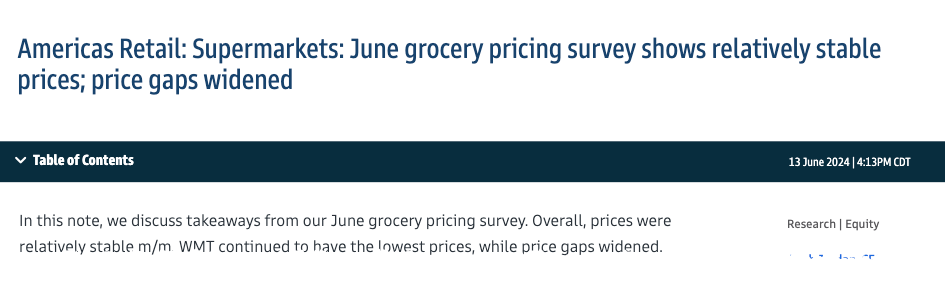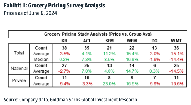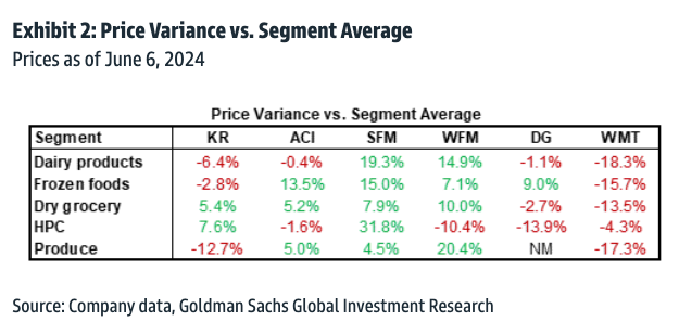 On June 6, Goldman analysts led by Leah Jordan analyzed the prices of 38 SKUs in the dairy, frozen goods, dry grocery, HPC, and produce categories. The retailers surveyed included Walmart, Sprouts Farmers Market, Whole Foods, and Dollar General.