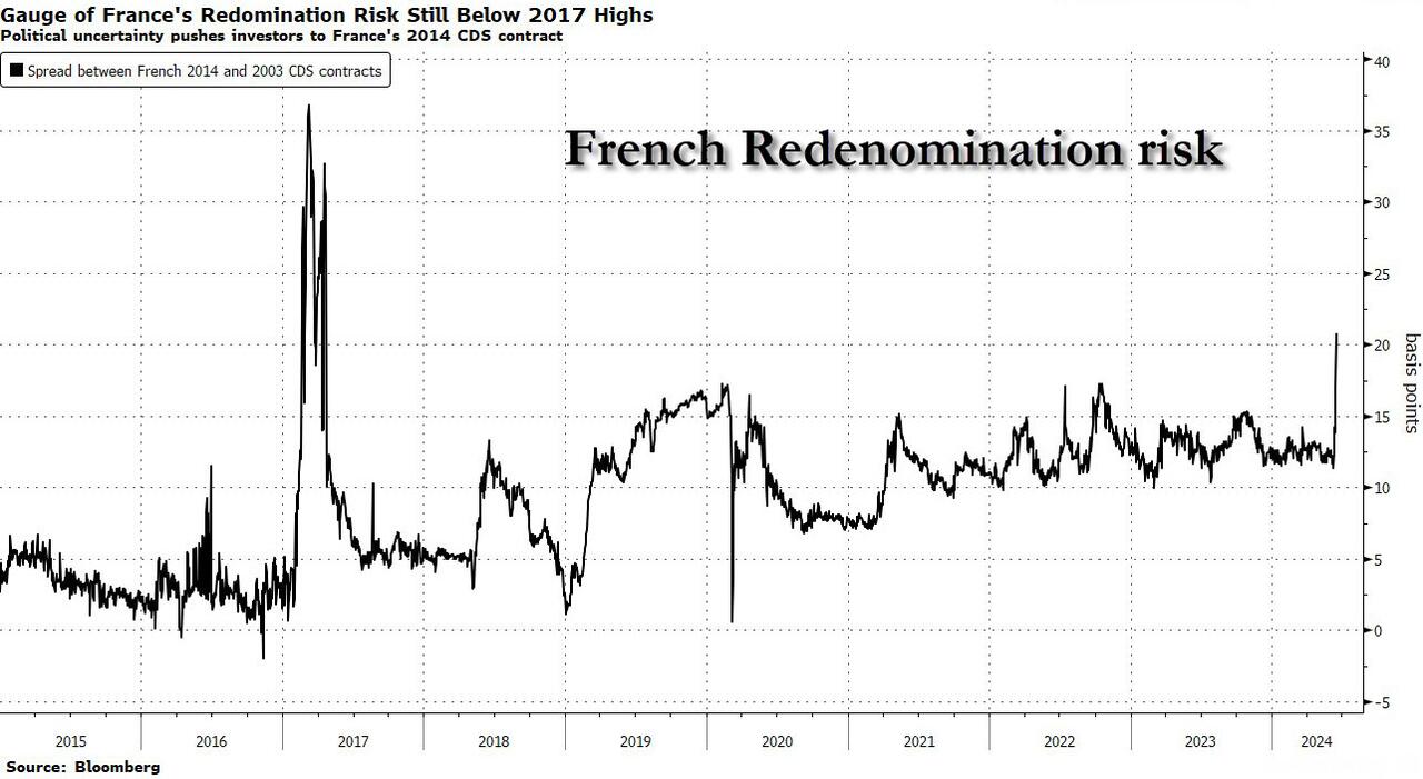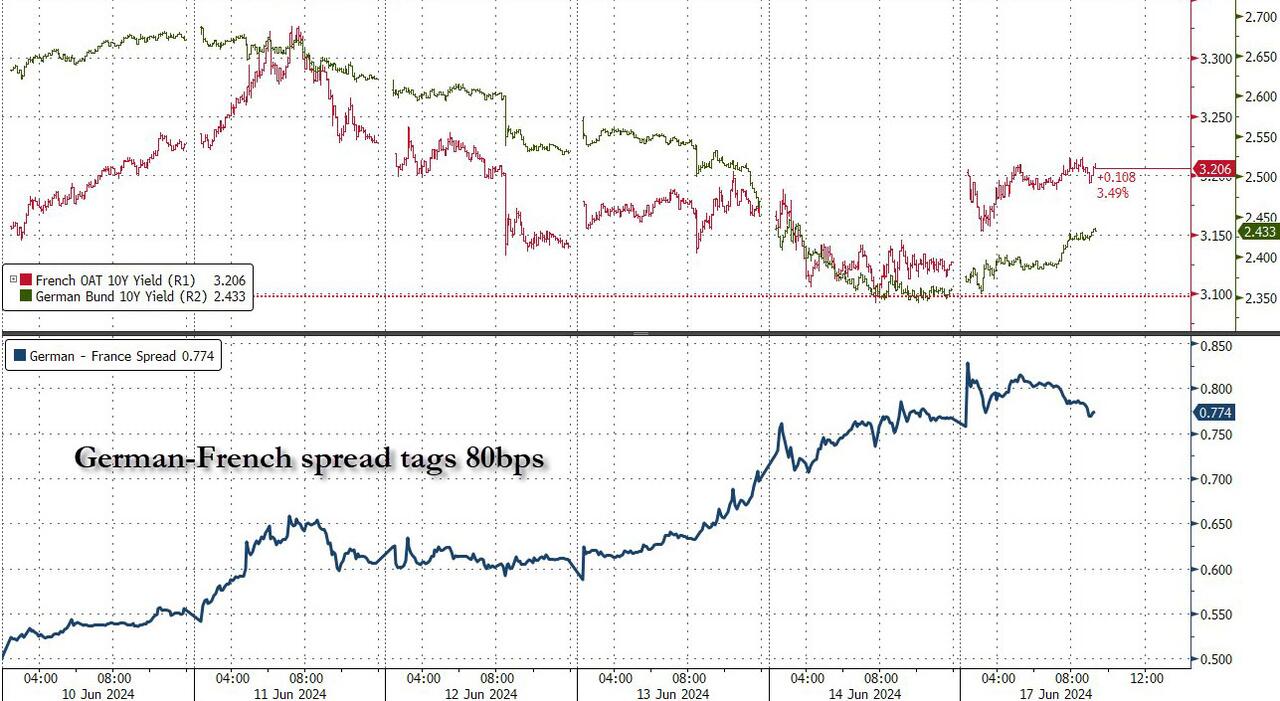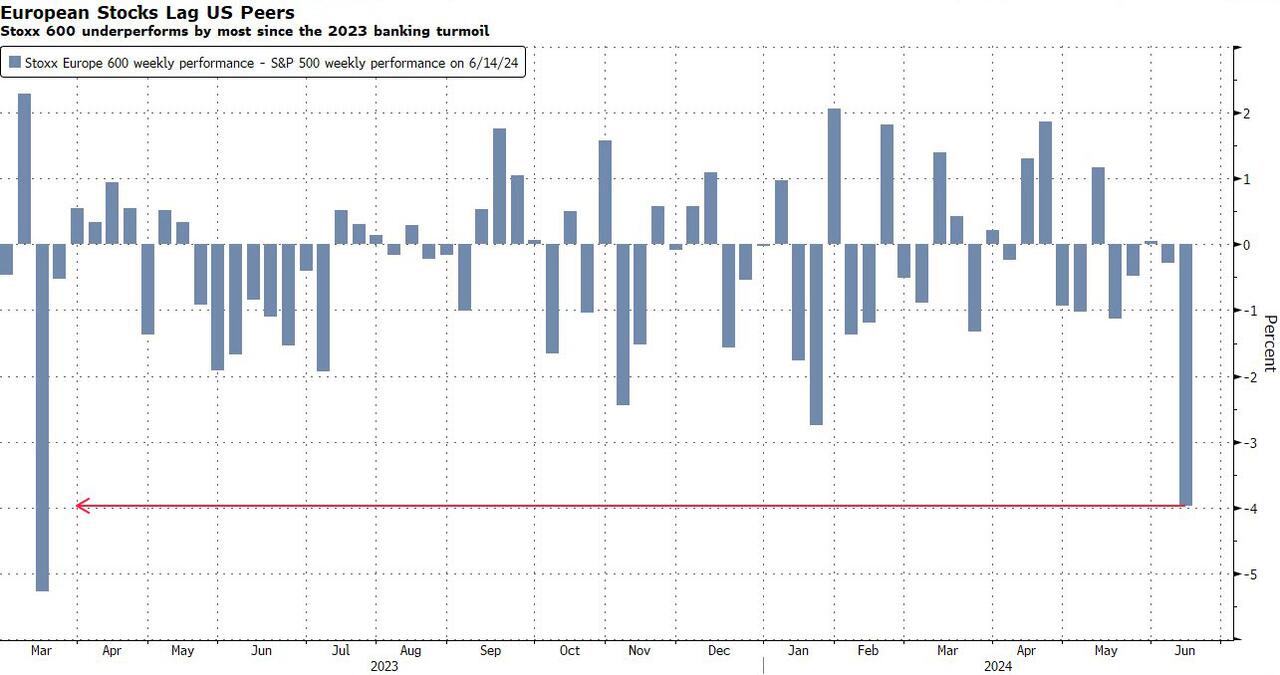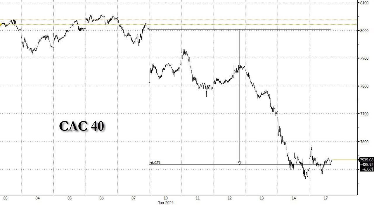 | BOJ keeps rates steady, decides to lay out bond taper plan next month http://reut.rs/3RsT5Qm Renewed concern about the French political situation and a 7-month low in the University of Michigan Consumer Sentiment for June weighted equities. European political pundits believe that Macron’s snap election scheme is backfiring on the French president. And Biden’s condition is worsening (below). French stock market plummets (2.7%) amid fears of far right election win CAC 40 index has its worst week since March 2022 after Macron’s decision to call snap elections France’s finance minister, Bruno Le Maire, warned that the country could risk a financial crisis if either the far right or left won… because of their heavy spending pledges… A poll this week showed that National Rally was on track to win the snap election and claim a third of the vote, ahead of France’s leftwing bloc, which is forecast to take 22%, and Macron’s centrists with 19% of the vote… https://www.theguardian.com/business/article/2024/jun/14/french-stock-market-plummets-amid-fears-of-far-right-election-win France is heading for a financial crisis that could bring the eurozone down – Telegraph (Pay wall) Macron has lit the fuse on a eurozone debt crisis… It was not the outcome he was looking for… It looks certain that he will lose… A French debt crisis has been simmering for years. Its credit rating has been downgraded twice in the last six months… Its overall debt burden has soared to 112pc of GDP… https://www.telegraph.co.uk/business/2024/06/14/france-heading-for-financial-crisi-could-bring-down-euro/ The University of Michigan Sentiment for June fell to 65.6 from 69.1; 72 was expected. Current Conditions tumbled to 62.5 from 69.6, 72.2 was expected! Expectations 67.6 from 68.8; 72 expected. 1-year Inflation 3.3%, 3.2% expected; 3.3% prior: 5-10-year inflation 3.1%, 3.0% expected and prior. ‘Current Conditions’ for Democratic voters tumbled from 102.4 in April to 92.1 in May and now to 81.6 in June. Dems are giving up on The Big Guy! https://data.sca.isr.umich.edu/fetchdoc.php?docid=75847 @ces921: Trigger Warning: Chart of the Day – UMich Inflation Expectations 5-10 years – Mean Expected. Up to 5.3%. You can argue all you want about how terrible this survey is, how it’s political, how it only surveys 400-600 people, whatever. Be Triggered Inflation expectations are not well-anchored in America regardless of what the Fed tells you. https://x.com/ces921/status/1801619373775352038 ESMs opened lower on Thursday night but steadily rallied until they hit a daily high of 5443.00 at 2:24 ET. Then they commenced a decline that turned into a tumble near 5 ET. ESMs hit a daily low of 5397.75 at 7:07 ET. The bounce that regularly appears after the 7 ET US repo market opening occurred. ESMs then steadily rallied, with several sizable drops, until they hit 5434.50 and rolled over at 13:15 ET. ESM retreated to 5421.75 at 14:17 ET. Buying for the expected late manipulation appeared. ESMs rallied to 5438.50 at 16:00 ET. The NY Fang+ Index was modestly negative for about one minute after the NYSE opening. The index was positive while other major indices were negative. Mag 7 buying is the main event right now. @StockMKTNewz: FOR THE FIRST TIME EVER: 3 US companies closed the week valued at more than $3 Trillion. (MSFT $3.289T, AAPL $3.258T, NVDA $3.224T; Google $2.192T, AMZN $1.911T) https://x.com/StockMKTNewz/status/1801713613285048809 @KobeissiLetter: Magnificent 7 stocks have officially exceeded $15 trillion in combined market cap for the 1st time ever. The group’s combined market cap now equals over 50% of US GDP. In just 2 months the Magnificent 7’s value has surged by a whopping $2 trillion. The Magnificent 7 stocks have rallied by over 60% over the last 12 months compared to only a 20% gain in the other 493 S&P 500 stocks. Combined they reflect over a record 30% of the entire S&P 500. (Yet Jerome sees no bubble!) @zerohedge: The Nasdaq hit a new all-time high with 72% of Nasdaq stocks closing red, and twice as many new lows as new highs. https://x.com/zerohedge/status/1801745890748571949 S&P 500 Index and its Advance-Decline Line – Negative divergence with a series of all-time highs Equal-Weight S&P 500 Index vs S&P 500 Index – Equal Weight S&P 500 is flat since mid-March @RepThomasMassie: Most intriguing policy idea from the GOP meeting at the Capitol Hill Club this morning: Trump briefly floated the concept of eliminating the income tax and replacing it with tariffs. Anything that simplifies the tax code would boost US productivity. Eliminating income taxes would eliminate millions of wasted hours on tax-related matters and billions of dollars in fees. Of course, this would hurt lawyers and accountants. The biggest impact would be on Congress. The Parliament of Whores would no longer be able to trade donations for tax benefits. Tariffs were the largest source of US revenue (being as much as 95% of revenue) from the 1790s until the 16th Amendment (allowed Congress to collect federal income taxes) was passed in 1913. Congress imposed the first US income tax in 1861 to finance the Civil War. It was repealed in 1872. Higher tariffs could also resurrect the US industry base and induce ‘fair trade’ on a wide scale. One could argue that Trump’s proposal would reward production, savings, and investment while penalizing consumption, especially of foreign goods. A few decades ago, a top aide to a West Coast Democratic Senator used to converse with us regularly. After we opined that the US needs a flat tax, the top aide said it would be great for Americans and the economy, but it would greatly diminish that ability of Congress to procure corporate donations in lieu of tax favors– so it would never happen. @ForAmerica: GOP Rep. @RepThomasMassie exposes the hypocrisy in Congress! “Congress has paid over $17 million in hush money for sexual misconduct, inside of the offices, in these buildin