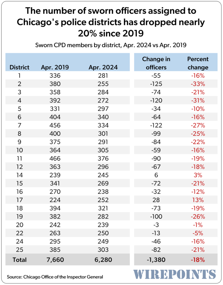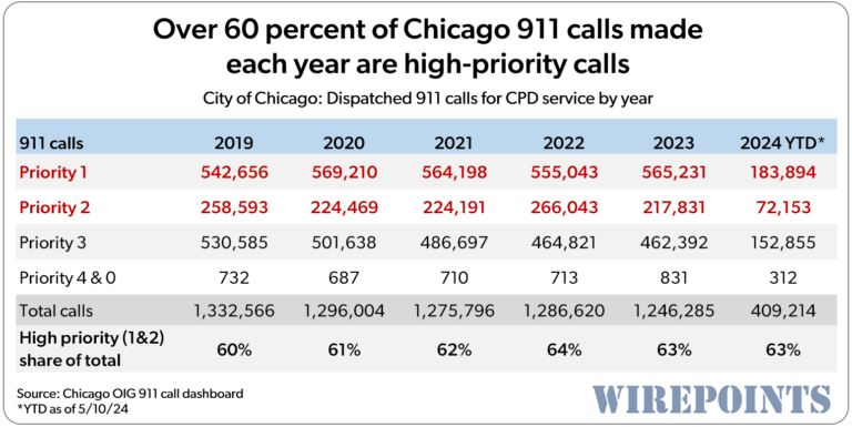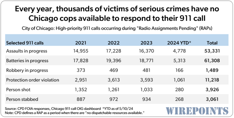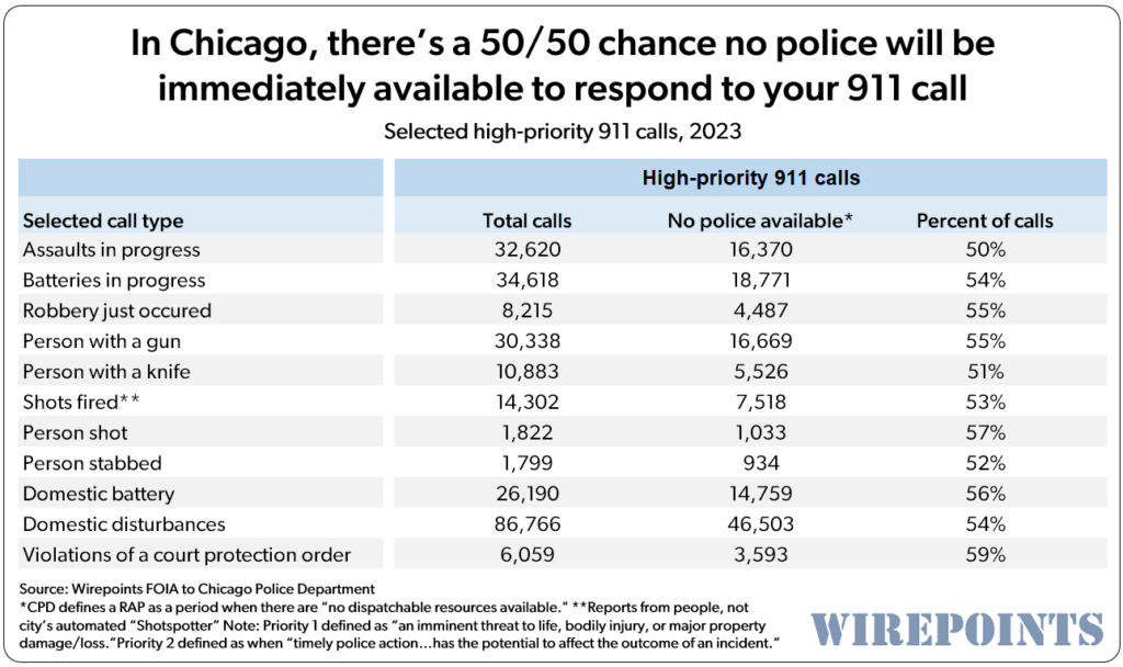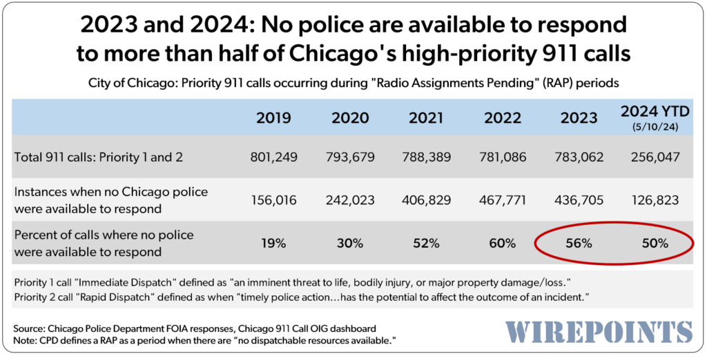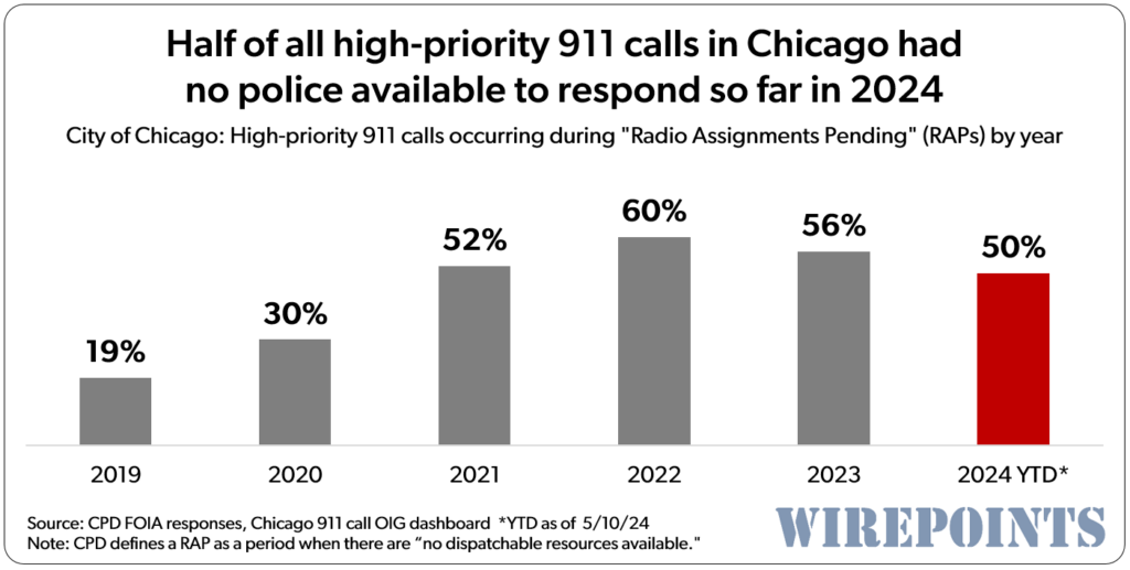 This year, the bad trend continues. So far in 2024, 127,000 of the 256,000 high-priority 911 calls made in Chicago had no police available to immediately respond. That’s a “no police available” rate of 50%.