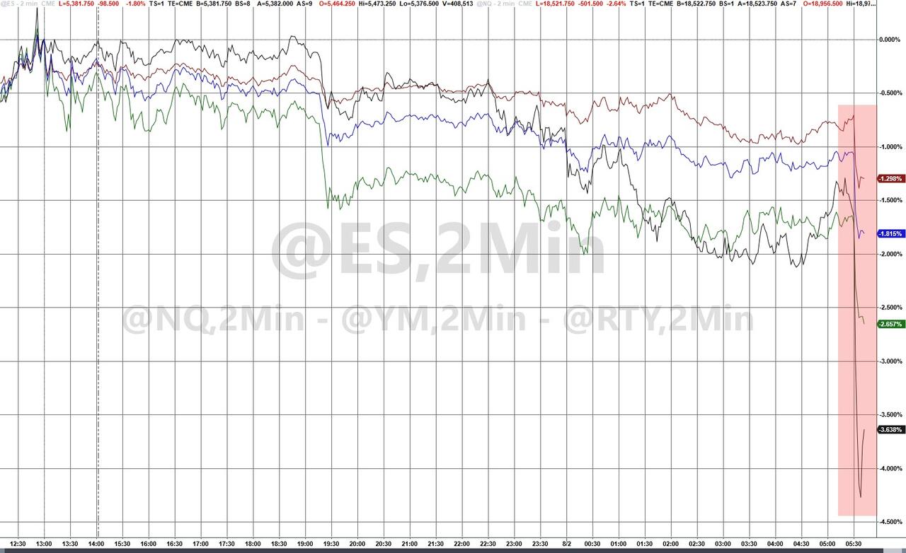It didn’t take long after today’s dismal jobs report to spark what Wall Street hopes will be a Fed panic. Indeed, just moments after a catastrophic jobs report which “nobody’ could have possibly predicted, well some notable exceptions, some of the biggest Wall Street analysts are already tearing up the soft landing playbook they were all pitching just, well, 24 hours ago and are urging the Fed to not just cut but panic while it’s doing it.
