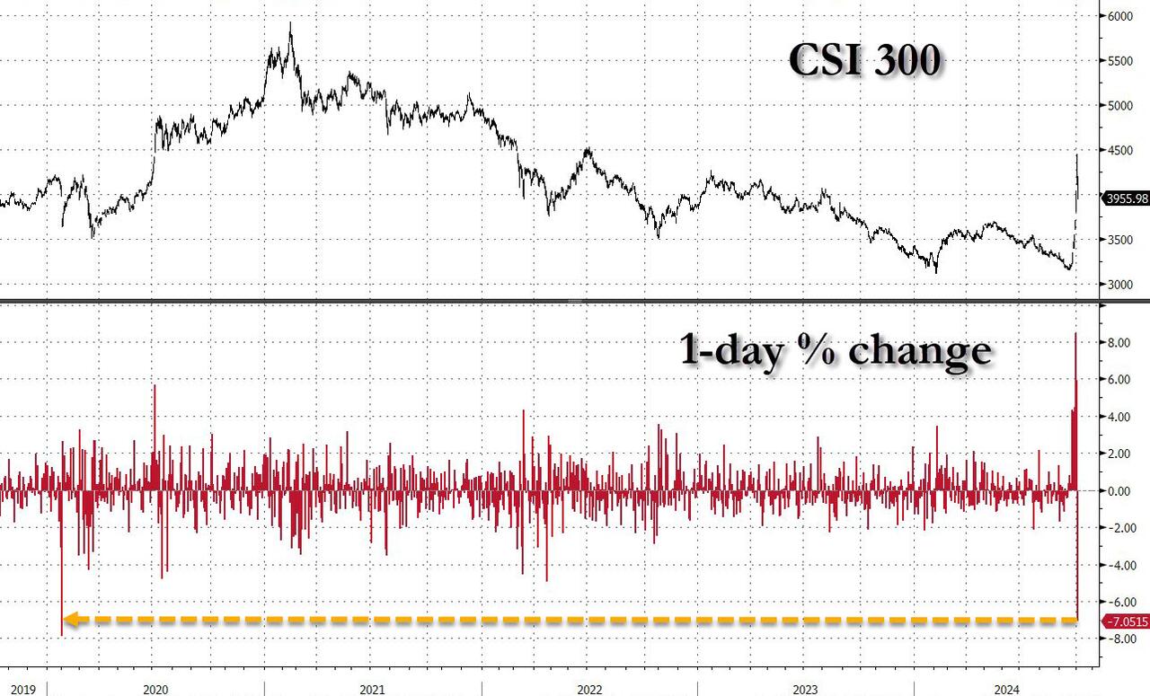 After being closed for the Golden Week holiday, Chinese stocks soared when they opened on Tuesday. The CSI 300 was +11%. Rabid selling appeared after the National Development and Reform Commission did NOT announce new stimulus schemes. The Hang Seng Index tumbled as much as 10.0% and closed -9.41%, its worst decline since the Lehman Crisis. The CSI 300 closed +5.93%. The Shanghai Composite closed +4.59%; it opened +10.1%.