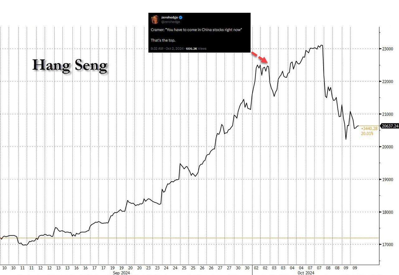 China’s Stock Euphoria Cools as Traders Reassess Stimulus Bets – BBG Anticipation for an opening pop had been building given the rally in Hong Kong-listed shares, reports of record account openings at major Chinese brokerages in preparation for Tuesday’s session and hopes that the press briefing by the nation’s top economic planning agency will offer more positive catalysts… Officials at the National Development and Reform Commission said they would speed up spending, while largely reiterating plans to boost investment and increase direct support for low-income groups and new graduates… https://finance.yahoo.com/news/china-stock-rally-fizzles-traders-023950970.html
