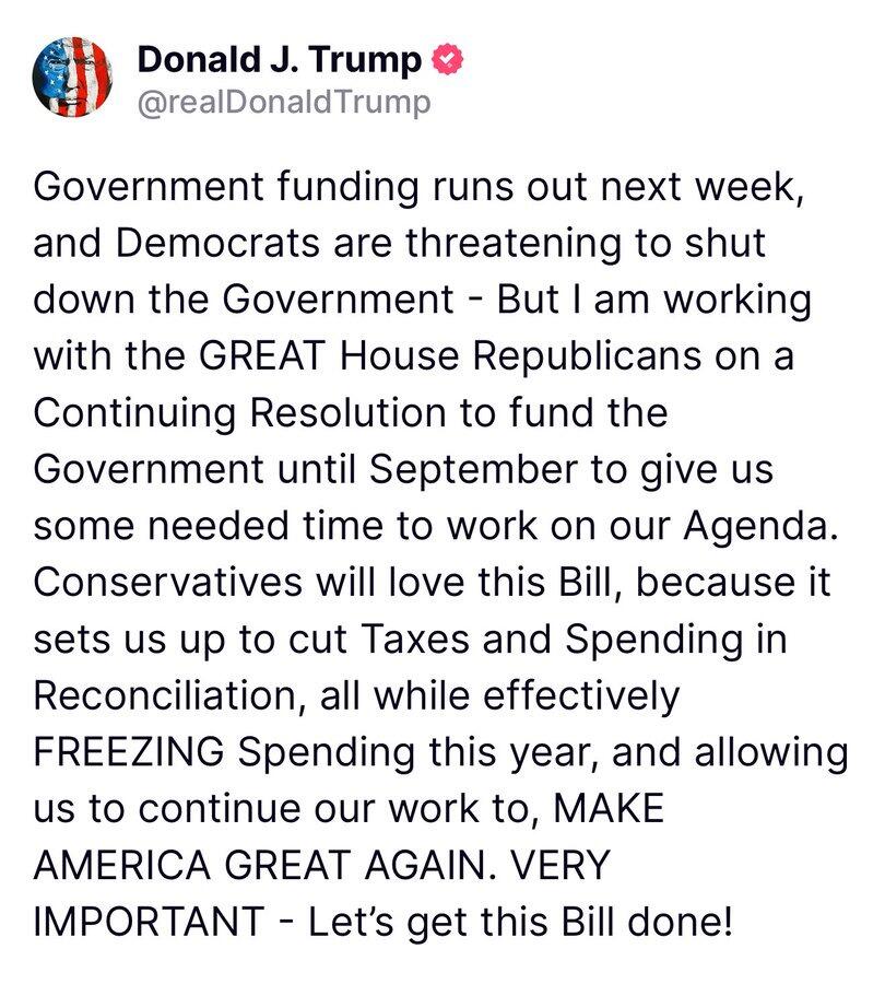 “Government funding runs out next week, and Democrats are threatening to shut down the Government – But I am working with the GREAT House Republicans on a Continuing Resolution to fund the Government until September to give us some needed time to work on our Agenda,” Trump posted on Truth Social, adding that doing so would allow for the administration to “cut Taxes and Spending in Reconciliation, all while effectively FREEZING Spending this year.”