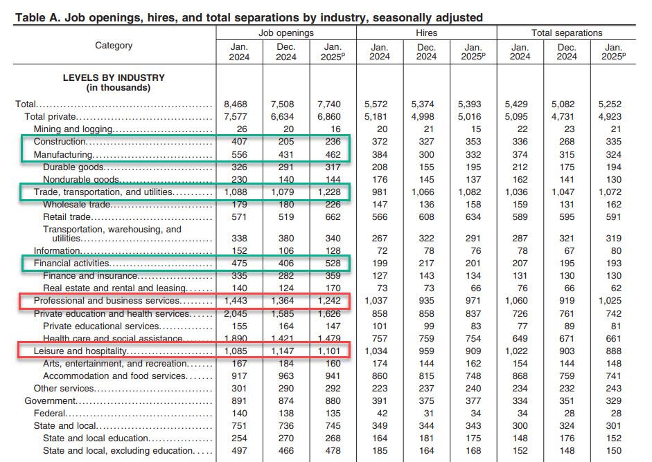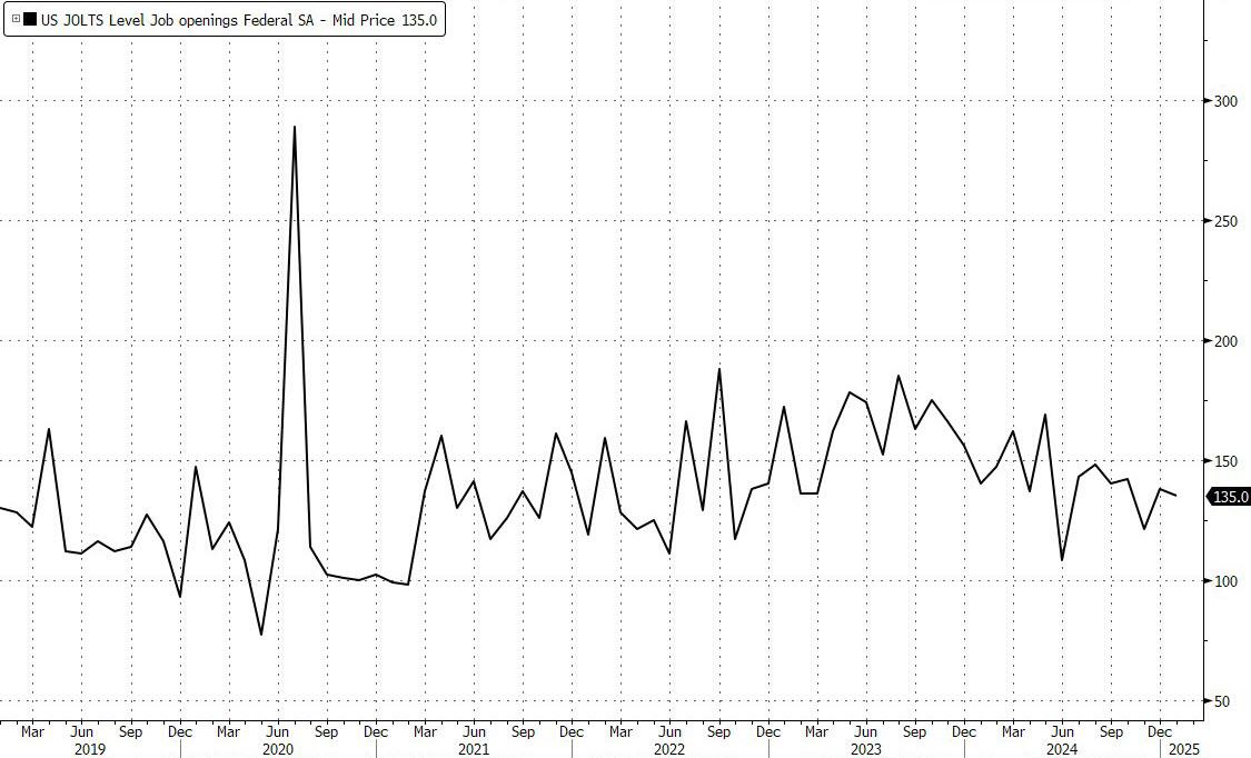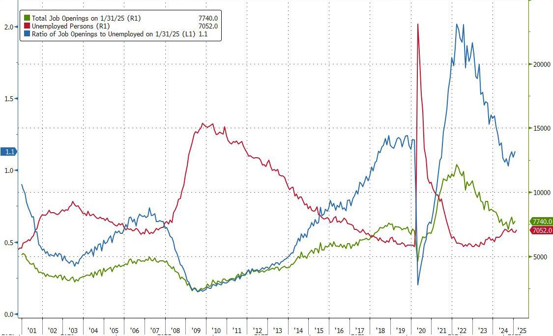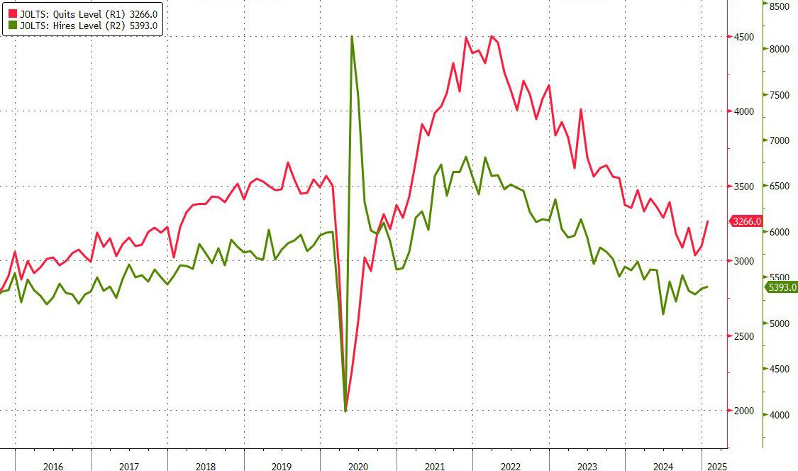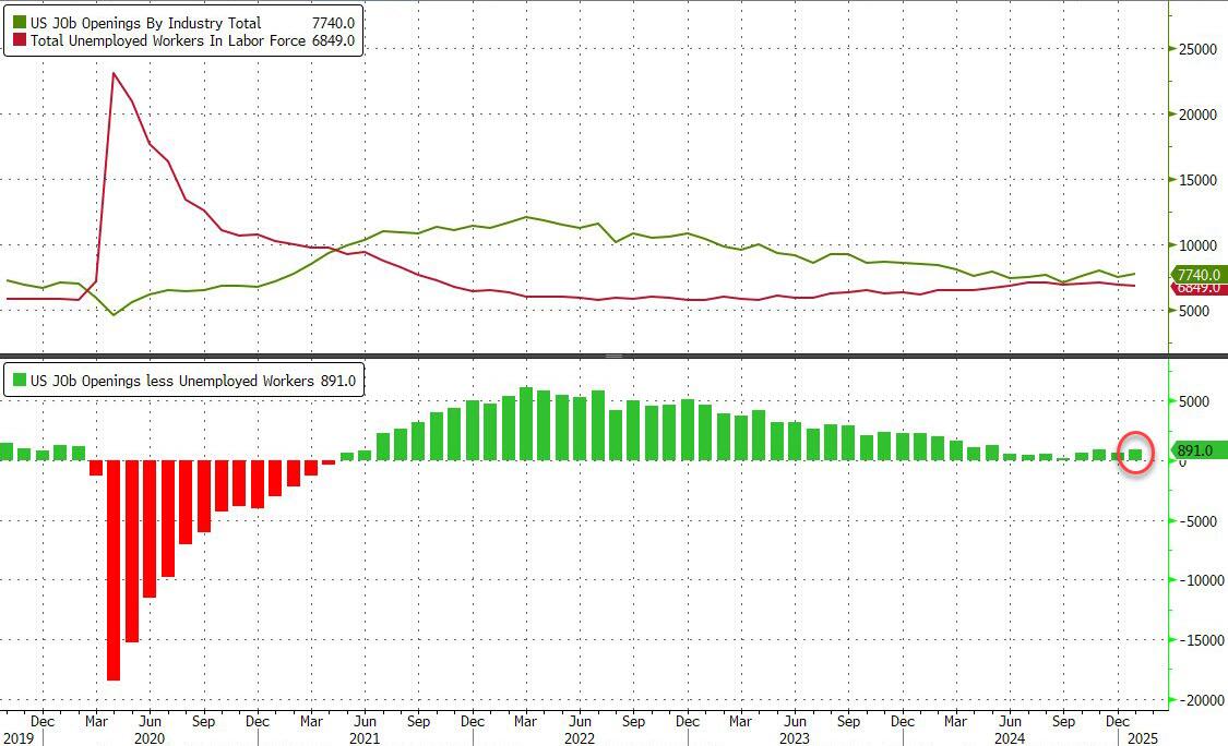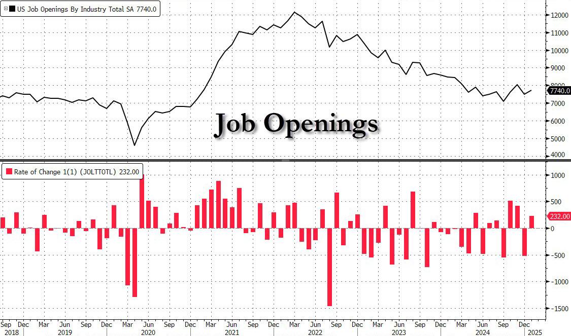 One month ago when the December JOLTS report came out, we were surprised to see just how bad the jobs market was in the first month of the Trump admin (as 556K job openings unexpectedly disappeared), a shocking contrast to the stellar labor market under Trump’s senile and dementia-addled predecessor. If anything, it was the clear early signal that a recession (or “detox” in the words of Bessent) was coming to the US, something we flagged at the time, and which has since been confirmed by both the president and the market, and sent stocks tumbling.