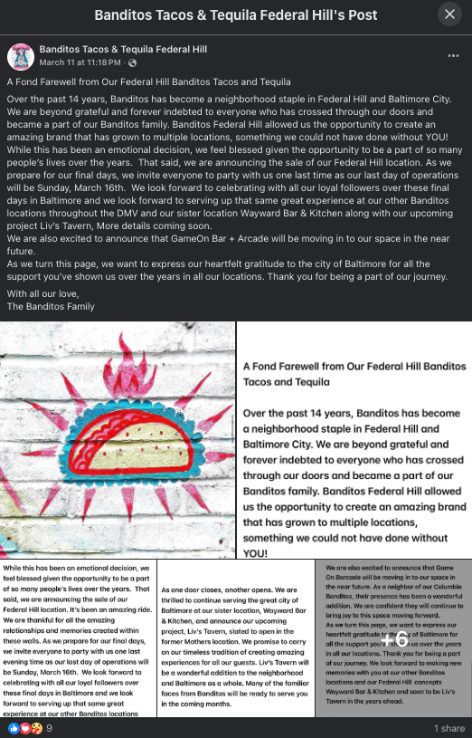 “Over the past 14 years, Banditos has become a neighborhood staple in Federal Hill and Baltimore City,” the restaurant wrote on Facebook earlier this week, adding, “Banditos Federal Hill allowed us the opportunity to create an amazing brand that has grown to multiple locations, something we could not have done without YOU!”