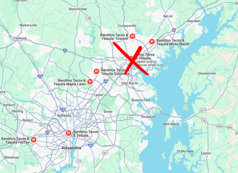 Banditos hedged its bets with locations outside the city, including in Towson, Columbia, and White Marsh, Maryland, and in Fairfax, Virginia.