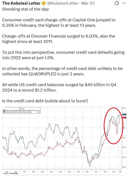 | March options and futures expired on Friday. Futures expired on the NYSE opening. ESMs traded in a 17-handle, mostly positive, range until they broke lower after 1:00 ET. ESHs sank, with two modest contra-rallies, until they hit 5684.50 at 4:512 ET. After a bounce to 5705.00 at 6:15 ET, ESMs traded sideways until they broke down near 8:25 ET. ESMs sank to 5651.25 at 9:27 ET. Traders then aggressively bought ESMs, which then vacillated wildly until they spiked to 5691.00 at 10:58 ET. Trader liquidation knocked ESMs down to 5679.75 at 12:01 ET. ESMs then went vertical to 5700.00 at 12:22 ET. ESMs then plodded higher on buying for the expected late ESM manipulation. After hitting a NYSE session high of 5711.00 (-0.25 points for the day) at 13:53 ET, ESMs stair-stepped lower. After falling to 5688.25 at 15:21, ESMs went inert as traders wait for the illegal manipulation. It commenced at 15:49 ET; ESMs were forced to 5722.25 at 16:00 ET. @zerohedge: 0DTE trading hits a new record high: 55% of all option volume https://t.co/KB5qviz16Q and small lot 0DTE trading is also a record high https://x.com/zerohedge/status/1902912553006608567 Bucket shops, once outlawed, are effectively operating again. @bespokeinvest: A 30 bps rally in the last 15 minutes of trading powered the S&P to its fourth Friday gain in a row. But…the S&P 500 is down 5.79% during this four-week Friday win streak. That’s the worst overall performance during a four-Friday win streak since at least 1952. What Ceasefire: European Gas Prices Jump After Ukraine Blows Up Key Gas Pumping Station in Russia in “Act of Terrorism” https://www.zerohedge.com/markets/what-ceasefire-european-gas-prices-jump-after-ukraine-blows-key-gas-pumping-station-russia @ABC: A Southwest Airlines flight almost took off from a taxiway — rather than a runway — at Orlando International Airport on Thursday before an air traffic controller stopped the plane, officials said. (Who was the pilot?) https://abcnews.link/wwKXbt6 Positive aspects of previous session An illegal manipulation to squeeze expiring March calls goosed ESMs during midday & near the close. Negative aspects of previous session Fangs and rallied only modestly. USMs were -10/32 at the NYSE close Ambiguous aspects of previous session Is the US Constitutional crisis a factor in the markets? First Hour/Last Hour Action [S&P 500 Index]: 1st Hour from NYSE Open: Down; Last Hour: Up Pivot Point for S&P 500 Index [above/below indicates daily trend to traders]: 5647.12 Previous session S&P 500 Index High/Low: 5670.84; 5603.10 Trump regarding violence against Tesla: “You didn’t have anything like that on Jan. 6.” @realDonaldTrump: People that get caught sabotaging Teslas will stand a very good chance of going to jail for up to twenty years, and that includes the funders. WE ARE LOOKING FOR YOU!! Tesla vehicles, dealerships targeted with arson, gunfire and vandalism in at least 9 states: FBI https://t.co/JWHexndJIV ELON MUSK: “The only company with all the ingredients for making intelligent human robots at scale is Tesla. My prediction is that Optimus will be the biggest product of all time by far. Nothing will even be close. I think it will be 10x bigger than the next biggest product ever made.” https://x.com/AutismCapital/status/1902914522459017375 Musk stated that ultimately 90% of US energy would be solar panels generating electricity. EU Leaders Fail to Agree on €5 Billion Ukraine Aid After Clashes EU leaders also sparred over the failure so far to put forward a senior figure as part of a bid to gain entry into the process and represent the 27-member bloc… https://www.yahoo.com/news/eu-ukraine-talks-spark-fresh-192040874.html @MdBreathe: Pfizer’s post-marketing surveillance analysis showed a miscarriage rate of 81%, a 5-fold increase in stillbirths, an 8-fold increase in neonatal deaths, and a 13% incidence of breastfeeding complications in newborns whose mothers received the COVID shots https://publichealthpolicyjournal.com/are-covid-19-vaccines-in-pregnancy-as-safe-and-effective-as-the-medical-industrial-complex-claim-part-i/ @overton_news: DOGE insider Sam Corcos, special adviser to the U.S. Treasury Department, just unloaded a jaw-dropping exposé on the IRS and Treasury’s chaotic operations… 1]. IRS’ Massive IT Dept. Outstrips Midsize Banks by 175x Budget and 40x Staff “A typical midsize bank will have somewhere between 1 and 200 people in IT and they have an operations and maintenance budget in like the $20 million a year range. We have 8,000 people in IT, and our operations and maintenance budget is $3.5 billion a year… the IRS processes about the same number of transactions as a mid-size bank… 2]. Contractors Eat Up 80% of IRS’ Massive Operations Budget… 3]. IRS’ Modernization Is a $3.7 Billion Money Pit… 4]. Ghost Contracts Bleed Millions with No Accountability https://x.com/overton_news/status/1902908276662210592 America First Legal Exposes Censorship Scheme by USAID and Global Engagement Center, Working with UK Government and Media Firms, to Use AI Censorship Tools The GEC and USAID coordinated efforts to censor “COVID-19 misinformation” and counter “COVID-19 propaganda.” The GEC collaborated with officials in the British Foreign, Commonwealth, and Development Office on disinformation efforts. The GEC coordinated with private media censorship firms, including Poynter and NewsGuard, which provided samples of its Misinformation Fingerprints artificial intelligence (AI) tool, designed to identify and rate websites based on their perceived “misinformation.” https://aflegal.org/america-first-legal-exposes-censorship-scheme-by-usaid-and-global-engagement-center-working-with-uk-government-and-media-firms-to-use-ai-censorship-tools/ NBC: The Bidens want back in – With the Democratic Party struggling to find a new direction, former President Joe Biden and former first lady Jill Biden have offered to jump in and help with fundraising and 