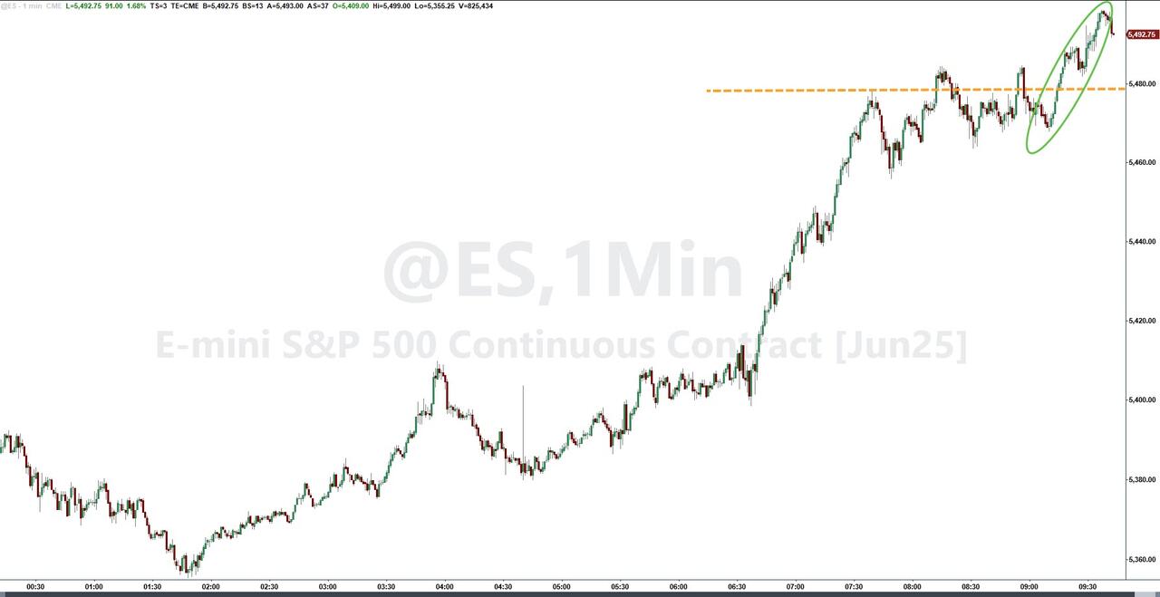 ESMs and NQMs soared during early Nikkei trading on Wednesday. After hitting 5424.00 at 19:13 ET, ESMs retreated to 5378.00 at 21:51 ET. A relentless rally then took ESMs to a daily high of 5499.75 at 9:59 ET. The ‘dump’ sank ESMs to 5453.50 at 10:16 ET. Another buying wave pushed ESMs to 5496.00 at 10:30 ET. ESMs then bounced to 5483.00 near 11:30 ET. ESMs then gently rolled over.