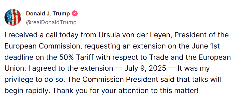 On Sunday night, Trump agreed to delay 50% tariffs on the EU until the 9th of July.