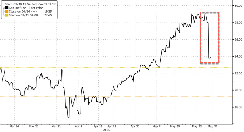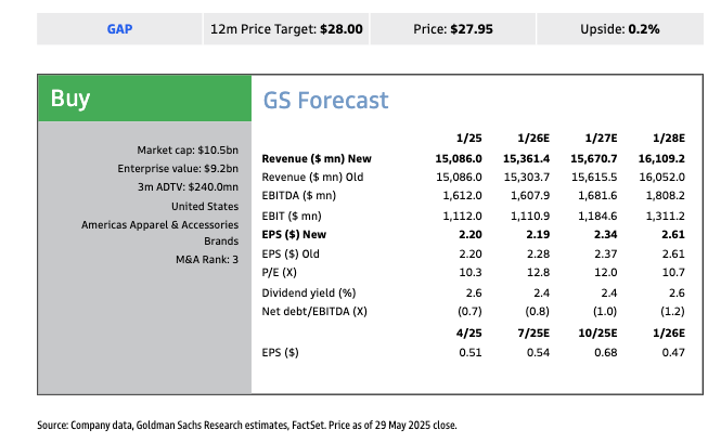 Citi analyst Paul Lejuez, who maintains a “Buy” rating on Gap, lowered his target to $30 from $33 due to the retailer’s higher tariff burden.