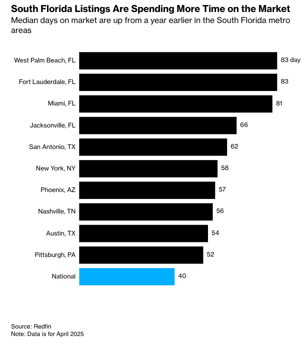 Redfin data shows that April home-purchase contracts in Miami, West Palm Beach, and Fort Lauderdale fell sharply from a year earlier — the steepest declines among the 50 largest U.S. metro areas. Pending sales dropped 23% in Miami, 19% in Fort Lauderdale, and 14% in West Palm Beach. Homes in all three markets also recorded the longest listing times nationwide.