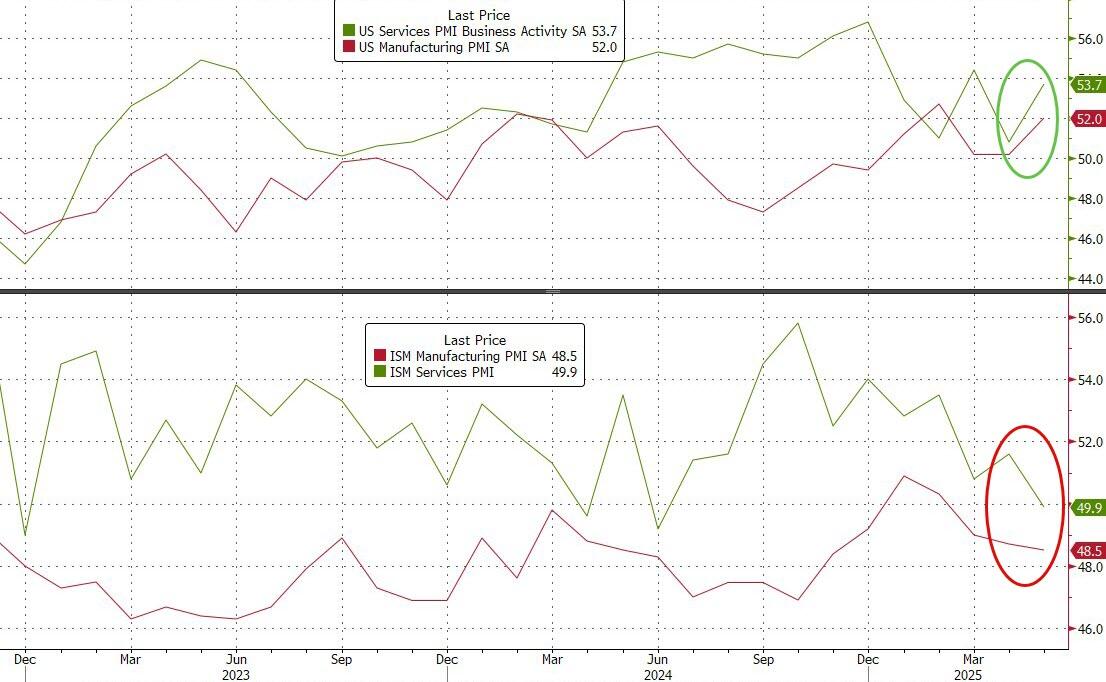 So, you decide: ISM Manufacturing UGLY, ISM Services UGLY; Manufacturing PMI STRONG, Services PMI STRONG!