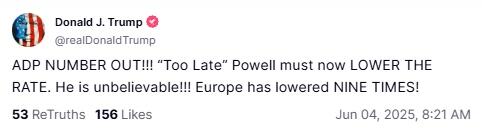 “Too Late!” – Trump Blasts Powell After Weakest ADP Jobs Report In Over 2 Years