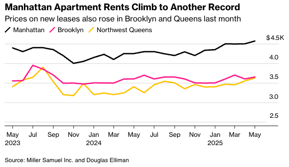 Bloomberg cited a new report from appraiser Miller Samuel Inc. and brokerage Douglas Elliman, which showed that Manhattan apartment rents reached $4,571 in May—marking the third record in four months and exceeding the previous high by $71.