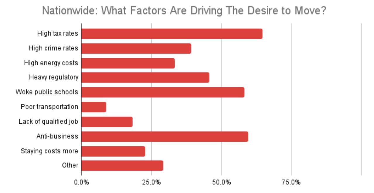 The reasons behind this discontent are no mystery. Among California business owners, 86.4% cite high taxes as a driving factor, while 84.9% blame anti-business government policies. Nationally, these same issues rank high, but not nearly to the same extent — 64.5% and 59.4%, respectively.