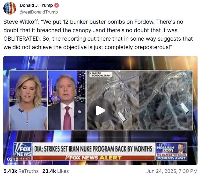 The POTUS, DJT: “I didn’t like plenty of things that I saw yesterday. I didn’t like the fact that Israel unloaded right after we made the deal… and now I hear Israel just went out because they felt there was violated by one rocket that didn’t land anywhere. That’s not what we want, I’ll tell you, and I’m telling you, I’m not happy about that, Israel, either… We basically have two countries that have been fighting so long and so hard that they don’t know what the f*** they’re doing. You understand that.” https://x.com/alx/status/1937505815272861719