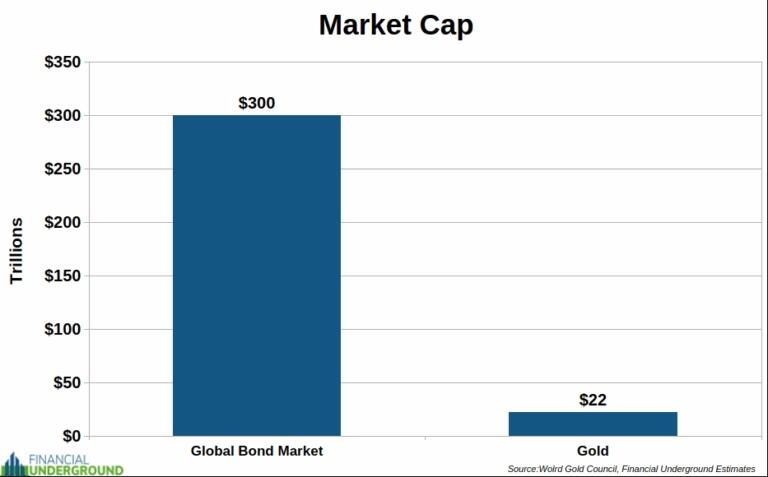 Compare that to all the gold ever mined in the world: worth about $22 trillion. That’s a mere 7% of the global bond market.