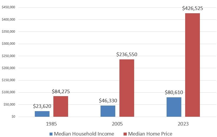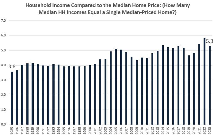 As home prices have risen, homes have become less affordable. Notably, the median home price has become much larger over time, when compared to the median household income. In 1985, for example, the median home price was 3.6 times the size of annual median household income. By 2023, the median home price was 5.3 times the median household income.
