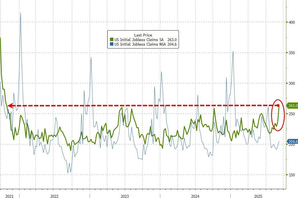 After four years of showing no signs of life, initial jobless claims surged higher last week with 263,000 American filing for jobless benefits for the first time – the most since Oct 2021…
