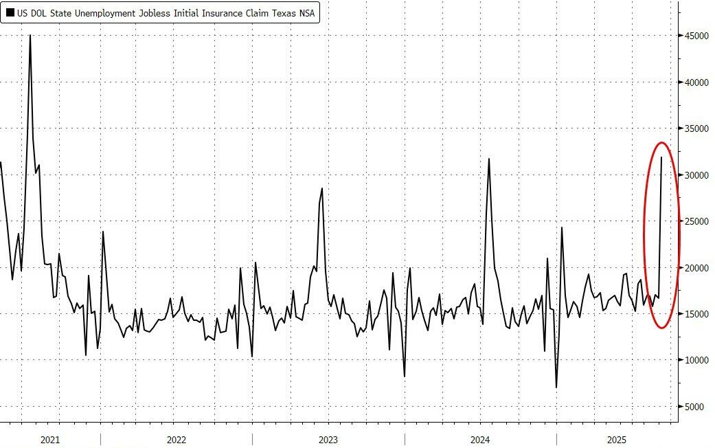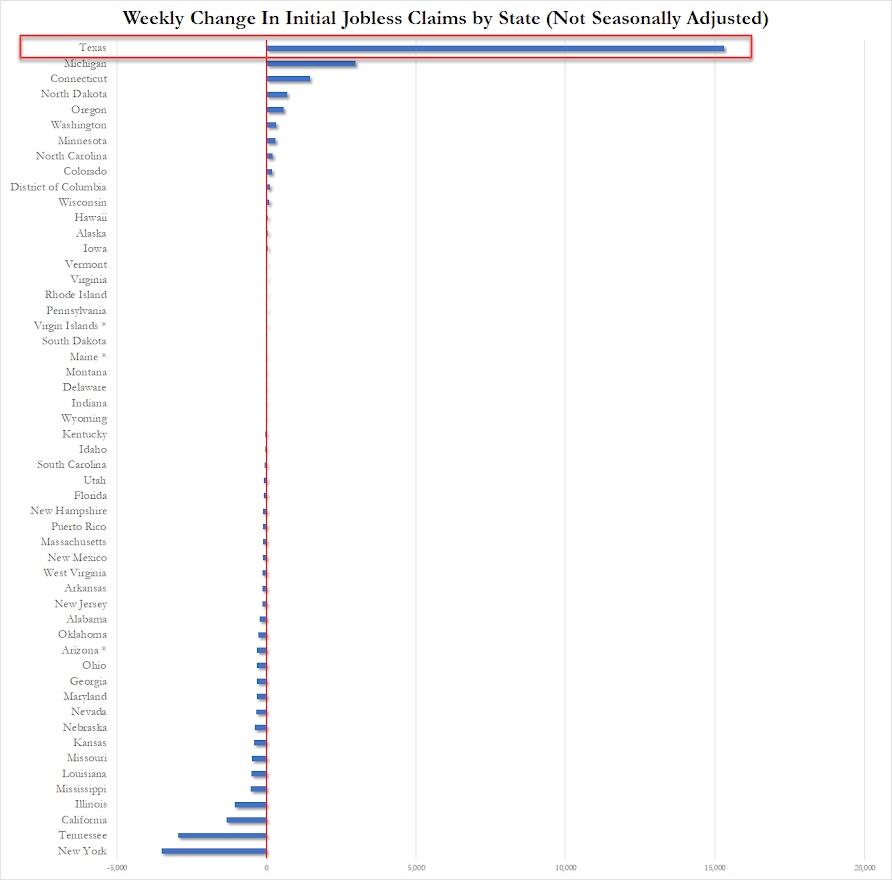 Under the hood, Texas massively dominated the surge in jobless claims last week (we are struggling to figure out why)…