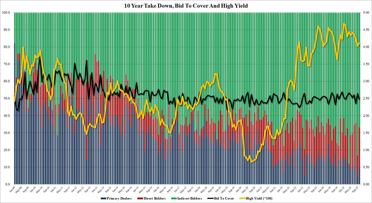 Overall, this was a subpar and disappointing 10Y auction, but it could have been worse, which is why while yields moved by 1-2bps higher across the curve, pushing the 10Y to 4.125%, they are well off yesterday’s session highs.