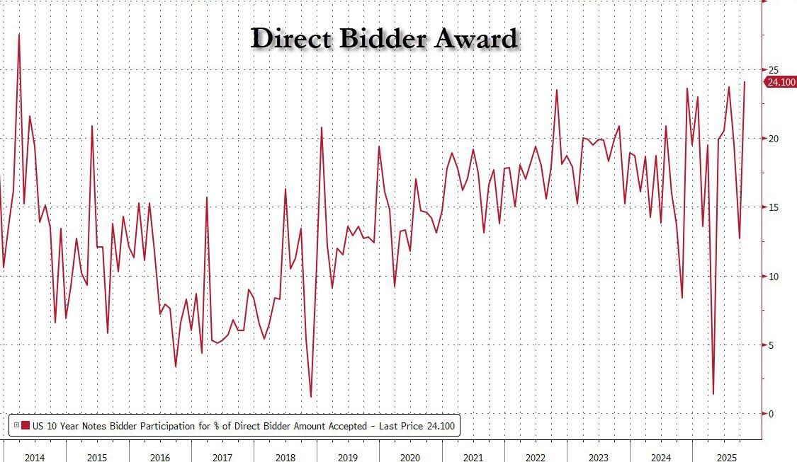 The note priced at a high yield of 4.117%, up from 4.033% in Sept, but except for that one month, it was the lowest since Oct 2024. The auction also tailed the 4.114% When Issued by 0.3bps, following last month’s stop and was the 2nd tail in the last 8 auctions.