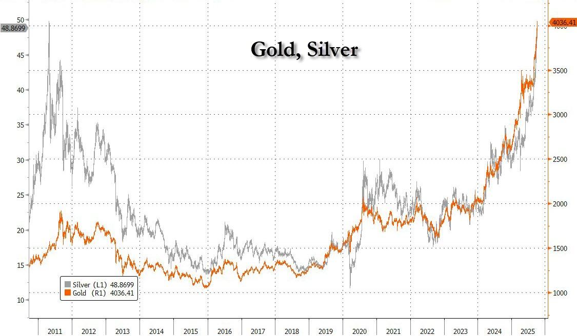Since the last FOMC meeting (when The fed cut rates by 25bps with one dissent for 50bps on Sept 17th), gold has gone to the moon, stocks are higher (as is the dollar) while bonds are down modestly…