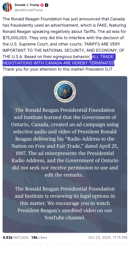 | ESZs traded modestly lower when the Nikkei opened on Thursday, but an-A-B-C rally turned them modestly positive. After topping out at 6740.50 at 19:10 ET, ESZs sank to 6717.50 at 20:02 ET. ESZs then jumped to 6748.25 at 21:33 ET. The move became an A-B-C rally that ended 9 minutes after the 3 ET European opening with ESZs at 6751.75. ESZs stair-stepped down to 6719.50 at 8:31 ET. The rally for the NYSE opening commenced; ESZs soared to a daily high of 6766.00 at 9:48. Pump & dump traders then sold; ESZs sank to 6739.00 at 10:19 ET. Traders bought for the 2nd Hour rebound. ESZs rebounded into volatile range trading until they trekked higher on this: Trump to Meet with XI Jinping Next Thursday – BBG 13:35 ET. Now we know why someone kept buying ESZs on Wednesday and Thursday. Market action clearly shows that entities are buying or selling stuff accurately before Trump’s moves. Qui bono? ESZs slowly but persistently trekked higher, hitting a daily high of 6785.75 at 15:00 ET. ESZs then did a super slomo rollover until they broke lower near 15:25 ET. ESZs fell to 6771.50 at 15:50 ET but ambled up to 6775.00 at 16:00 ET. @sentdefender: Trump announced Thursday that he had pardon Changpeng Zhao, a Chinese-born Canadian billionaire who is best known for being the co-founder and CEO of Binance. Zhao resigned as CEO in November 2023 after pleading guilty to a money laundering charge in the United States and was sentenced to four months in prison in April 2024, which he completed that same September. Binance and cryptos soared after Trump pardoned ‘CZ.’ DJT is really pimping crypto! Or are crypto billionaires pimping Trump? How powerful is the crypto lobby? How big are DJT family’s crypto bets? NYT: To seek the pardon, Mr. Zhao hired lawyers and lobbyists with ties to the Trump administration, while Binance struck a business deal with World Liberty Financial, the Trump family’s crypto start-up. That deal alone is poised to generate tens of millions of dollars a year for the Trumps and the family of Steve Witkoff, the president’s top Middle East adviser… Mr. Trump has granted clemency to several other prominent crypto executives… And since Mr. Trump took office, regulators have dropped lawsuits against Coinbase and other large crypto firms… Long considered the crypto industry’s richest man, Mr. Zhao… admitted that he had violated the law by failing to install rigorous compliance systems at Binance. That allowed people in sanctioned countries and terrorist groups like Hamas, Al Qaeda and the Islamic State to move money on his platform… https://www.nytimes.com/live/2025/10/23/us/trump-news#trump-pardons-cz-binance Dem Senator Warren alleges that ‘CZ’ “boosted one of Donald Trump’s crypto ventures.” https://x.com/BrendanPedersen/status/1981401763958681667/photo/1 We have regularly averred that crypto is patently unconstitutional. But the US has not shut it down because it is probably used by US intel to discern illicit activities, including terrorist acts and bribes. The Powers of Congress: Article I, Section 8 – Article I, Section 8 of the Constitution enumerates Congress’s powers. The powers regarding currency include the following: “The Congress shall have the power to . . . [5] To coin Money, regulate the Value thereof, and of foreign Coin, and fix the Standard of Weights and Measures; [6] To provide for the Punishment of counterfeiting the Securities and current Coin of the United States;” Article I, Section 8, Clause 5 is known as the coinage clause. It gives Congress the exclusive power to coin money. The Supreme Court has also interpreted clause 5 as giving Congress the sole authority to regulate every aspect of United States currency… https://constitution.findlaw.com/article1/annotation37.html Someday an enterprising investor might take a massive short position in Bitcoin and other cryptos and then file a lawsuit against The Genius Act. The suit would eventually go to the SCOTUS. If the SCOTUS rules against the issuance clause in The Genius Act, a global financial crisis would result. Can States Coin Their Own Money Under the Constitution? States are prohibited from coining their own money. This restriction is found in Article I, Section 10, Clause 1 of the U.S. Constitution: “No State shall… coin Money; emit Bills of Credit; make any Thing but gold and silver Coin a Tender in Payment of Debts.”… https://legalclarity.org/can-states-coin-their-own-money-under-the-constitution/ Google AI: The GENIUS Act, or Guiding and Establishing National Innovation for U.S. Stablecoins Act, is a landmark legislation aimed at regulating stablecoins in the United States, ensuring consumer protection and establishing a clear framework for the digital currency market. The GENIUS Act: New Rules for Stablecoins (Digital Dollars) – Who Can Issue Stablecoins The GENIUS Act makes it illegal for anyone except specially licensed companies to create stablecoins in the United States. Two Paths to Get Licensed: Smaller Companies (Under $10 Billion in Stablecoins Outstanding): Can get licensed by individual states (Violates Constitution, see above) (like getting a state business license) States must follow federal standards, but the process may be simpler and faster. Good option for startups and smaller operations Larger Companies (Over $10 Billion in Stablecoins Outstanding): Must get federal licenses from either the Federal Reserve or the Office of the Comptroller of the Currency… https://complyfactor.com/clarity-and-genius-acts-2025-complete-compliance-guide-for-crypto-businesses/ @FoxNews: Senate blocks Republican bill to pay federal workers during shutdown, with only 3 Democrats (PA’s Fetterman and the 2 Georgia senators – purple state Sens.) voting yes @TheTonus: It will likely be Sen’s Ossoff & Warnock (GA Sens) who start to split away to join Fetterman, Cortez-Masto, and King in the bipartisan bid to reopen the govt. Dem. support is plummeting in mor