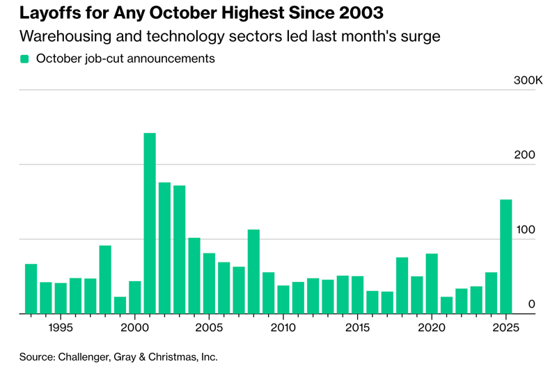 - In October alone, Cost-Cutting was the top reason employers cited for job reductions, responsible for 50,437 announced layoffs. Artificial Intelligence (AI) was the second-most cited factor, leading to 31,039 job cuts as companies continue to restructure and automate. AI has been cited for 48,414 job cuts this year.