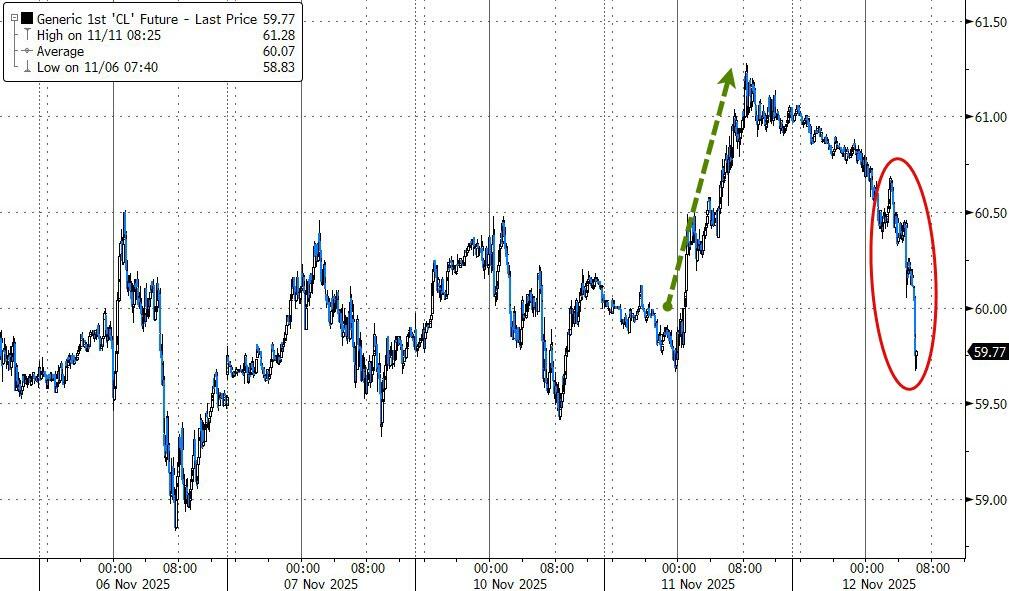 | Softbank (Japanese investment firm that specializes in tech) sold its entire ($5.8B) Nvidia stake to fund new AI investments, specifically with OpenAI and Oracle. NVDA fell as much as 3.4%. CoreWeave, an AI darling, lowered its annual sales forecast to $5.05B to $5.15B from $5.35B due to a delay in fulfilling a customer contract. The stock tanked as much as 15.04% (10:29 ET). @GordonJohnson19: Did CRWV cut 2025E CAPEX due to its customers materially reducing the amount of pre-payment cash they extend to the company when placing new orders (i.e. meaning CRWV doesn’t have the $ to spend on CAPEX)?… https://x.com/GordonJohnson19/status/1988275895866716240 ‘Big Short’ investor Michael Burry accuses AI hyperscalers of artificially boosting earnings “Understating depreciation by extending useful life of assets artificially boosts earnings – one of the more common frauds of the modern era,” Burry wrote. “Massively ramping capex through purchase of Nvidia chips/servers on a 2-3 yr product cycle should not result in the extension of useful lives of compute equipment. Yet this is exactly what all the hyperscalers have done.” Burry estimated that from 2026 through 2028, the accounting maneuver would understate depreciation by about $176 billion, inflating reported earnings across the industry. He singled out Oracle and Meta Platforms, saying their profits could be overstated by roughly 27% and 21%, respectively, by 2028… https://t.co/Rk71pvHFph @shanaka86: SILICON VALLEY’S $170 BILLION LIE: THE ACCOUNTING FRAUD HIDING IN PLAIN SIGHT – META, Microsoft, Google, Amazon, Oracle: five titans quietly extended server depreciation from 3 years to 6 years between 2022-2024. Audited. Legal. Disclosed in footnotes nobody reads… Here’s what that means in English: $400 billion spent annually on Nvidia GPUs that become obsolete every 12 months, depreciated as if they’ll generate cash for six years. The math is simple. The implications are catastrophic. By 2028, this accounting maneuver will have inflated reported earnings by $170 billion. Not revenue. Pure phantom profit. META alone books $2.9 billion in “savings” by pretending AI servers last 5.5 years. Oracle’s earnings are overstated 26.9% by fiscal 2028… https://x.com/shanaka86/status/1988107106235675016 The Great AI Earnings Illusion: How Silicon Valley Engineered $170 Billion in Phantom Profits https://substack.com/inbox/post/178568795?r=6p7b5o&triedRedirect=true @zerohedge: Oracle Is First AI Domino to Drop After Barclays Downgrades Its Debt to Sell “ORCL would run out of cash by the November 2026 quarter, implying substantial funding needs.” https://x.com/zerohedge/status/1988284110461186527 ORCL sank as much as 4.98% (10:55 ET). @HedgieMarkets: Meta’s chief AI scientist Yann LeCun, a Turing Award winner who headed Meta’s AI Research Lab since 2013, is leaving to found his own start-up focused on “world models.” LeCun has long argued that large language models will never reason like humans, putting him at odds with Zuckerberg’s AI vision… Meta’s Turing Award-winning AI pioneer is leaving after Zuckerberg pays $14.3 billion for a 28-year-old’s company and restructures so LeCun reports to him. That’s a vote of no confidence in the strategy. Meta paying $100 million packages to lure outside talent while losing its own chief scientist shows desperation… This is the pattern where companies spend massively chasing AI while fundamental talent questions the approach… https://x.com/HedgieMarkets/status/1988318558989025448 The FT: Investor angst over Big Tech’s AI spending spills into bond market Debt issued by groups building data centres has been hit in recent weeks (Stocks always get it last!) Microsoft announced that it would spend $10B on and AI data center along the Portuguese coast. MSFT fell as much as 0.7% but rallied to a 0.53% gain. Due to the above news, investors and traders sold Fangs and related AI stocks. The valuation rotation out of Fangs and into DJIA stocks also appeared. Given the carnage in CoreWeave and Nvidia, the NY Fang+ Index decline was moderate early because ‘they’ rotated into other AI darlings and CoreWeave is NOT in the NY Fang+ Index. Apple was +1.97% at 10:28 ET and Netflix was +1.0% at 9:50 ET. DJIA leaders at 11:15 ET: Merck +3.39%, Nike +3.37%, Amgen 2.15%, Verizon + 1.67% Though the cash bond market was closed for Veterans’ Day, USZs rallied moderately on an ADP forecast of -45k jobs in October and a Goldman forecast of -50k NFP for October due to large government job layoffs and 100k jobs lost to Trump’s deferred-resignation program. Last week ADP said its Employment Change for October was +42k! What gives? On Monday night, the Senate passed a bill that would fund the US government through January. The House will vote on the Senate bill today near 4 ET. Bank of England sees wider QE benefits cushioning big losses https://t.co/NdRGLADcG9 The BoE updated its standard estimate of the net lifetime loss stemming directly from QE to between 60 billion pounds ($80.5 billion) and 120 billion pounds, depending on the future path of interest rates… had delivered extra benefits by allowing Britain’s government to issue debt more cheaply… (‘Inflate or die’ from the dreaded debt deflation death spiral) ESZs traded sideways but mostly moderately higher from the Nikkei opening on Tuesday until they broke lower at 23:50 ET. ESZs then plodded lower until they hit a low of 6830.50 (-26.25) at 10:55 ET. After a rebound and manipulation for the 11:30 ET European close that took ESZs to 6851.00 at 11:24 ET, ESZs slid to 6830.75 at 11:30 ET on liquidation for the European close. The post-European close move lifted ESZs. But ESZs and stocks zoomed to the moon in the afternoon because traders perceived the Softbank selling of NVDA to fund AI investments as a signal to buy AI-related stocks. @ycharts: What a swing! 11:00 AM ET: Nasdaq: -0.80%; &P 500: -0.32%; Dow Jo