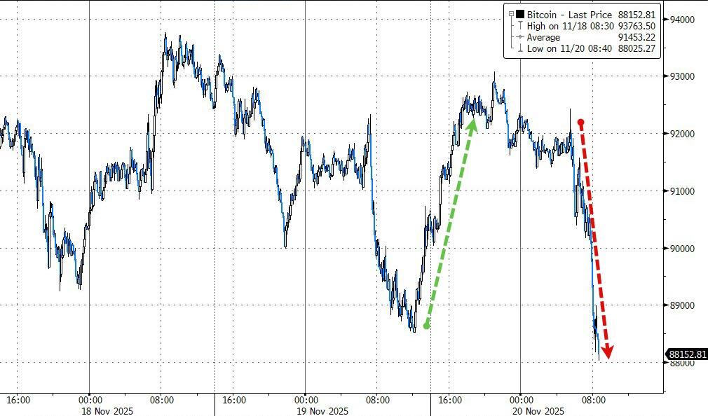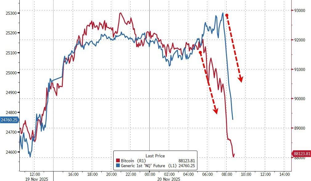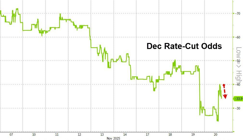 | WSJ’s @NickTimiraos: After the September jobs report (out Thursday), there won’t be another jobs report until after the Dec. 9-10 FOMC meeting. BLS: The October jobs report is cancelled. The November report won’t land until Dec. 16. Sept JOLTS is also cancelled. Oct JOLTS will be published Dec. 9. Fed officials have insisted they can still do their job forecasting the economy without the top-tier data everyone uses to calibrate their analysis of the second- and third-tier data, but market probabilities of a Dec cut —which has been shaping up to be a close call—have fallen on this news. The odds of a Dec cut hadn’t fallen more amid recent hawkish commentary from Fed officials due to the potential for data decay in those higher-fidelity reports. @Kalshi: Bureau of Labor Statistics cancels jobs report December rate cut odds drop from 50% to 29% https://kalshi.com/markets/kxfeddecision/fed-meeting/kxfeddecision-25dec https://x.com/StockMKTNewz/status/1991226275516543249/photo/1 Alphabet Shares Soar on ‘Rave Reviews’ for New Gemini AI Model – BB Soared as much as 6.9%… in contrast to Open AI’s GPT-5 model, which was met with mixed reactions… Google (Alphabet) peaked at 10:15 ET (304.25) and then did a 45-degree decline to 293.41 at 12:41 ET. While Google was zigging, Meta was zagging. META was -2.6% at midday on a Cantor Fitz downgrade. Nvidia traded in concert with Google. It hit a peak of 187.855 at 10:30 ET and then fell to a daily low of 182.83 (+1.47 points) at 12:37 ET. The rally to get long for NVDA’s results then began. Minutes of the Federal Open Market Committee, October 28-29, 2025 Market participants left their macroeconomic outlooks little changed, and they appeared to continue to interpret data made available over the period as consistent with a resilient economy… Participants agreed that the recent tightening in money market conditions indicated that it would soon be appropriate to end balance sheet runoff and that reinvestments of principal payments received on agency securities holdings should be directed into Treasury bills… Information on the labor market was limited by the federal government shutdown; however, available indicators were consistent with a continued gradual cooling in the labor market without any evidence of a sharp deterioration. Consumer price inflation had moved up since earlier in the year and remained somewhat elevated… Conditions in U.S. short-term funding markets tightened materially over the intermeeting period but remained orderly… Credit remained generally available but relatively tight for small businesses. Issuance of corporate bonds, leveraged loans, and private credit was robust in recent months… In their discussion of inflation, participants observed that overall inflation had moved up since earlier in the year and remained somewhat above the Committee’s 2 percent longer-run goal. Participants generally noted that core inflation had remained elevated, as disinflation in housing services had been more than offset by higher goods inflation, reflecting in part the effects of tariff increases implemented earlier in the year. Several participants observed that, setting aside their estimates of tariff effects, inflation was close to the Committee’s target. Many participants, however, remarked that overall inflation had been above target for some time and had shown little sign of returning sustainably to the 2 percent objective in a timely manner… https://www.federalreserve.gov/monetarypolicy/files/fomcminutes20251029.pdf ESZs vacillated between modest gains and moderate losses from the Nikkei opening on Wednesday until they broke higher after 5 ET. After double topping at 6668.75 at 6:08 ET & 6:50 ET, ESZs slid to 6635.75 at 9:31 ET. Conditioned buying for the NYSE opening appeared; ESZs went nearly vertical, abetted by Alphabet AI euphoria, to a daily high of 6709.00 at 10:16 ET. Aggressive selling appeared in Fangs and equity futures. ESZs sank to 6622.00 at 12:40 ET. ESZs rebounded to 6668.25 at 13:36 ET on buying for the possibility of dovish Fed Minutes, due at 14:00 ET. The FOMC Minutes emphasized ‘elevated inflation’ more than expected. ESZs slid to 6628.75 at 414:39 ET. The last hour rally was enhanced by buying for Nvidia’s results. ESZs soared to 6679.50 at 15:17 ET. After a modest retreat, ESZs jumped to 6683.75 at 15:38 ET. Nvidia rallied in concert with ESZs, or vice versa. ESZ then slid to 6658.25 at 16:00 ET. @Callum_Thomas: Private Equity stocks are imploding. Starting to look like a bit of a canary in the coalmine moment… https://x.com/Callum_Thomas/status/1990950872470167629 S&P Listed Private Equity Index – Listed PE companies that meet specific size… requirements Positive aspects of previous session Google and Nvidia led Fangs higher, which boosted other stocks during the 1st 45 minutes of trading. Negative aspects of previous session Cryptos got hammered; the wealth destruction should induce selling of other assets. Stocks peaked during the first hour of NYSE trading. Precious metals rallied moderately. The yen/$ hit 157.21. Ambiguous aspects of previous session How big of a problem is burst cryptocurrency bubble? First Hour/Last Hour Action [S&P 500 Index]: 1st Hour from NYSE Open: Up; Last Hour: Up Pivot Point for S&P 500 Index [above/below indicates daily trend to traders]: 6645.15 Previous session S&P 500 Index High/Low: 6689.75; 6603.50 Bitcoin (-4% at low) & cryptocurrencies got hammered on Wednesday. Bad news for the Trump family. Trump Media stock crashes to all-time lows, wiping out $5B in First Family wealth during crypto slide (Sucked in the ‘Trump uber alles’ cultists) https://t.co/LnqU7x7rI8 Trump: “Investment in AI is helping to make the U.S. Economy the ‘HOTTEST’ in the World.’ But overregulation by the States is threatening to undermine this Major Growth Engine. Some States are even trying to embed DEI ideology into AI models, producing ‘Woke AI