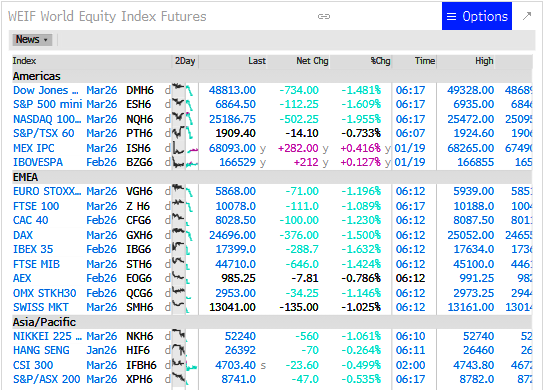 Asian and European stocks, along with US equity index futures, are deeply in the red this morning as tensions between President Trump and Europe intensify over Greenland.