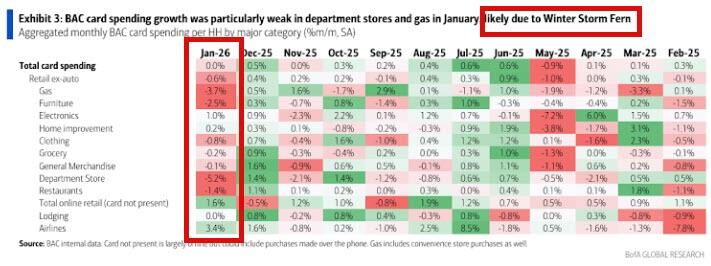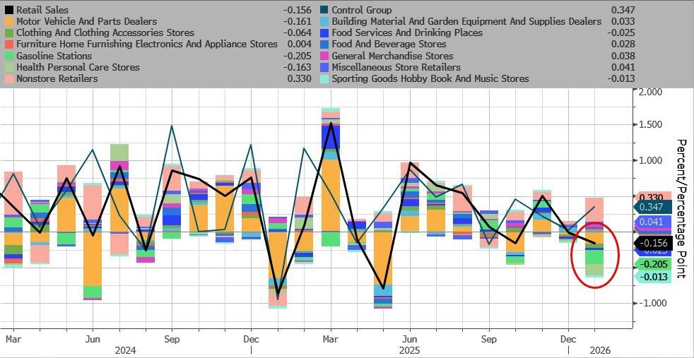 This morning’s retail sales data is for January (still lagging due to the govt shutdown) and is expected to be a decline (BofA’s omniscient analysts see a worse than consensus drop MoM, due in large part to weather disruptions).