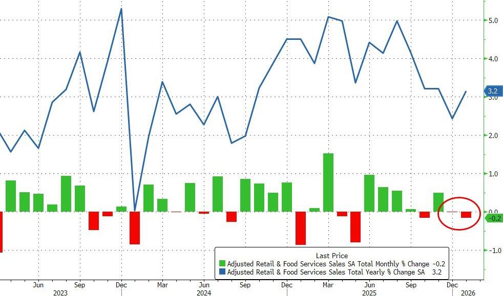 The actual print was a decline but slightly better than expected at -0.2% MoM. Despite two months of no increase, sales rose 3.2% YoY in January (increased from December)