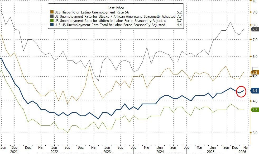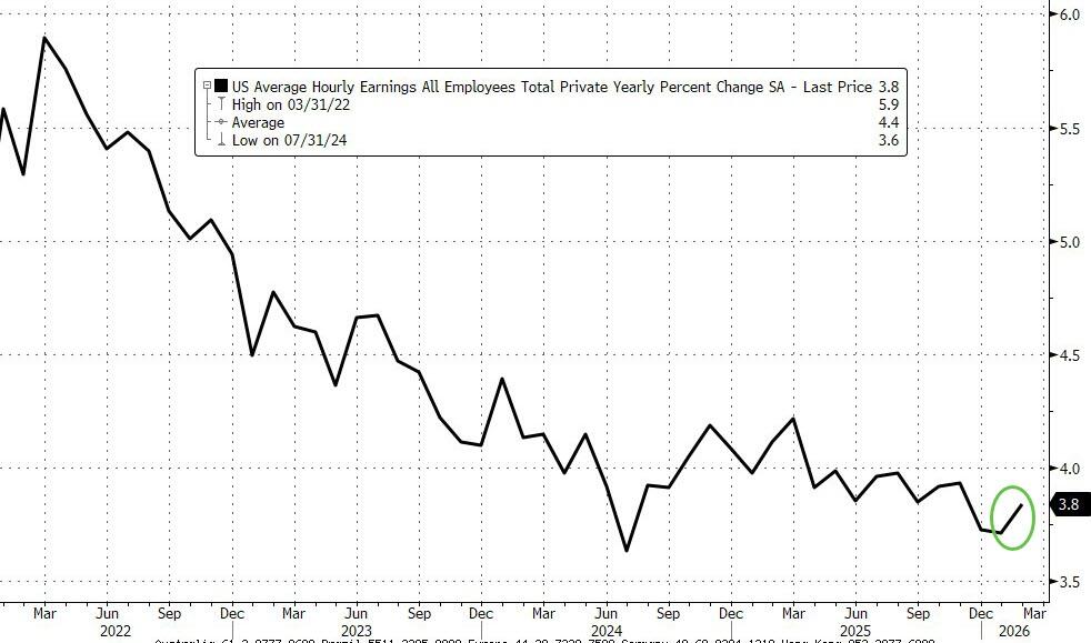 While we will have more to say about this report, the kneejerk reaction is, well, bad: this was about as ugly as it could be, and coming in a time when input costs are soaring due to the Iran war, it screams AI-driven stagflation.