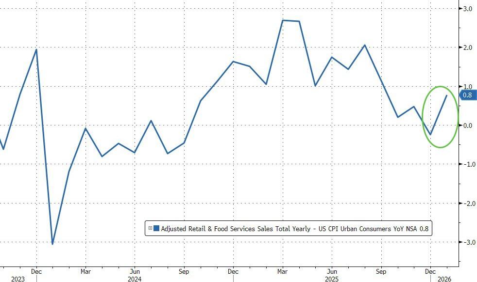 ‘Real’ retail sales (very roughly adjusted by CPI) showed an acceleration in January…