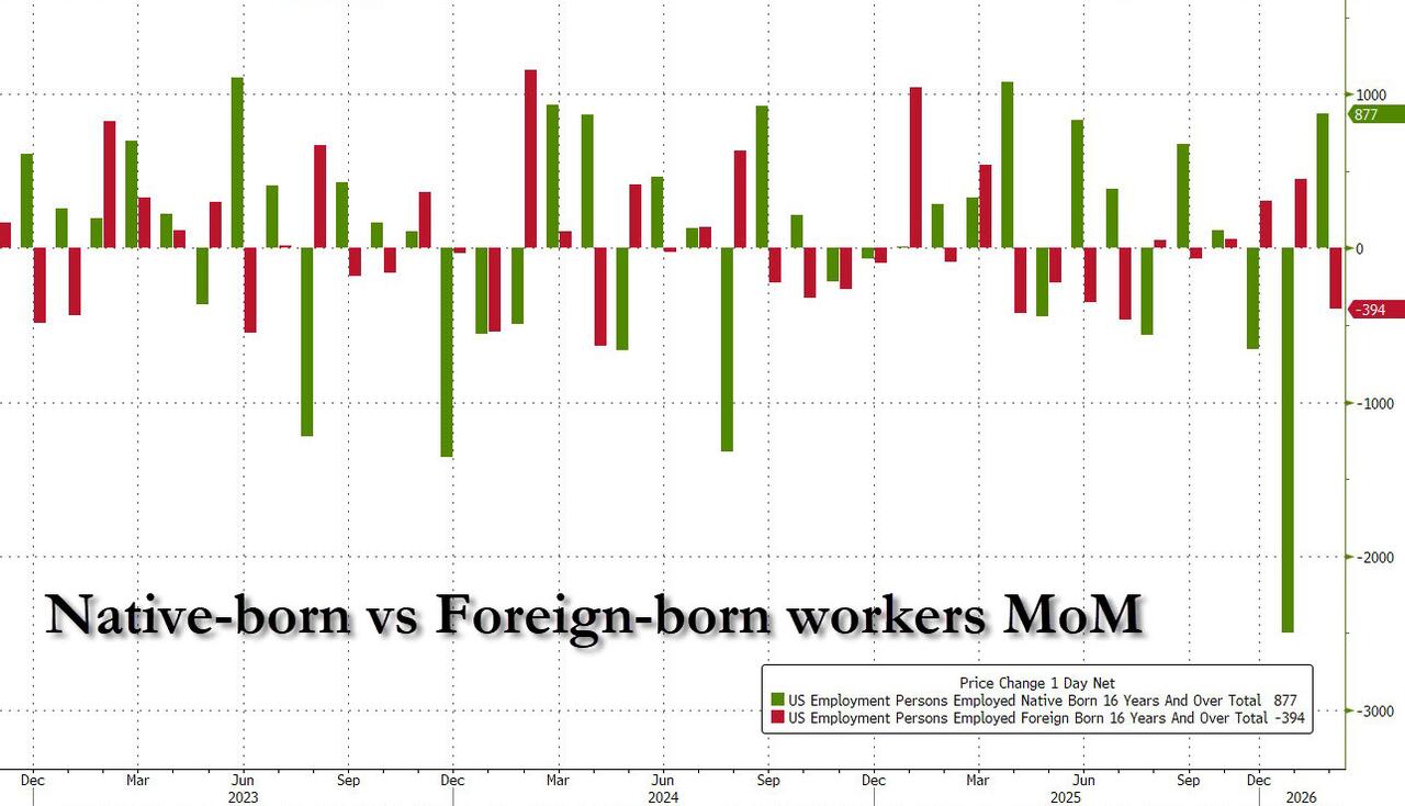 The data showed that since Trump entered the White House “the number of foreign born workers has slumped from a record 33.7 million in March 2025 to 32.1 million, a drop of $1.6 million. This has been offset by a slow but consistent increase in native-born workers which had been unchanged for six years since 2019 until the start of 2025, at which point it started to rise again, and has increased from 131.2 million in March 2025 to a new record high of 133.2 million in September.”