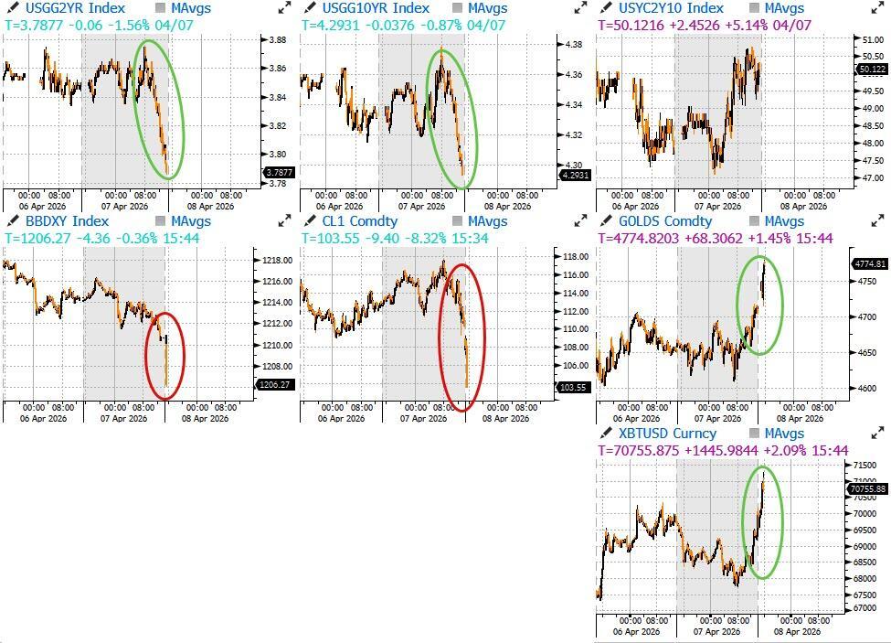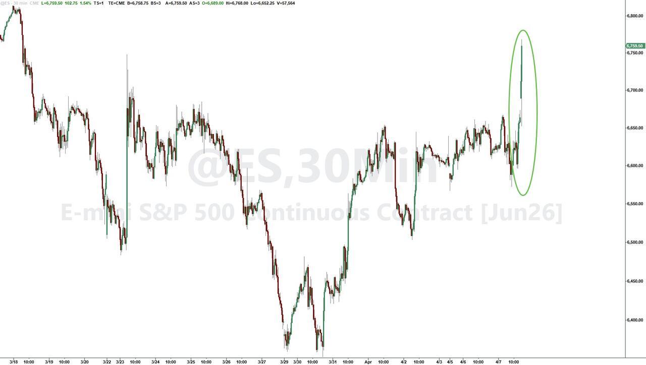 | Trump TACOs again – extends deadline for two weeks at Pakistan’s behest! Trump: Based on conversations with Prime Minister Shehbaz Sharif and Field Marshal Asim Munir, of Pakistan, and wherein they requested that I hold off the destructive force being sent tonight to Iran, and subject to the Islamic Republic of Iran agreeing to the COMPLETE, IMMEDIATE, and SAFE OPENING of the Strait of Hormuz, I agree to suspend the bombing and attack of Iran for a period of two weeks. This will be a double-sided CEASEFIRE! The reason for doing so is that we have already met and exceeded all Military objectives and are very far along with a definitive Agreement concerning Long-term PEACE with Iran, and PEACE in the Middle East. We received a 10-point proposal from Iran, and believe it is a workable basis on which to negotiate. Almost all of the various points of past contention have been agreed to between the United States and Iran, but a two-week period will allow the Agreement to be finalized and consummated… it is an Honor to have this Long-term problem close to resolution… i24News: Iran accepts Pakistan… 2-week ceasefire following ‘last minute’ intervention by China Iran State TV: Trump’s humiliating retreat from anti-Iran rhetoric. Trump accepts Iran terms for ending the war – Reuters. Iran’s Supreme National Security Council: The enemy, in its unfair, illegal, and criminal war against the Iranian nation, has suffered an undeniable, historic, and crushing defeat… This victory forced criminal America to accept Iran’s 10-point plan, in which America is fundamentally committed to non-aggression, the continuation of Iran’s control over the Strait of Hormuz, the acceptance of enrichment, the removal of all primary and secondary sanctions, the termination of all resolutions of the Security Council and the Board of Governors, the payment of damages to Iran, the withdrawal of American combat forces from the region, and the cessation of war on all fronts, including against the heroic Islamic Resistance of Lebanon… The field was narrowed for the enemy on all fronts to such an extent that not only were none of the enemy’s primary objectives realized, but the enemy realized—approximately 10 days after the start of the war—that it had no capacity for victory. Consequently, it began attempting to contact Iran through various channels and methods to request a ceasefire.” https://x.com/hey_itsmyturn/status/2041652939282849921 US military strikes against Iran have stopped according to the two-week cease-fire agreement: NYT Axios’ @BarakRavid: A first round of negotiations between the United States and Iran on an agreement to end the war is planned to take place in Islamabad on Friday, according to two sources… Israel has agreed to the ceasefire and will also suspend its strikes on Iran for two weeks… The White House official said ceasefire will come into force when Iran opens the Strait of Hormuz Equity futures surged; gas & oil sank on Tuesday night. ESMs hit 6818.75 (+162.00) at 19:26 ET; NQMs hit 25,091.25 (+720.25) at 20:02 ET. More details and chronology of events below. ‘A whole civilization will die tonight’ says Trump as Iran defies nearing deadline “A whole civilization will die tonight, never to be brought back again. I don’t want that to happen, but it probably will,” Trump wrote on his Truth Social website. “However, now that we have Complete and Total Regime Change, where different, smarter, and less radicalized minds prevail, maybe something revolutionarily wonderful can happen, WHO KNOWS? We will find out tonight, one of the most important moments in the long and complex history of the World.”… https://www.yahoo.com/news/articles/iran-defiant-eve-trumps-ceasefire-042120448.html WSJ on Tuesday morning: Iran has cut off direct communications with the U.S. over President Trump’s threat to destroy Iran’s “whole civilization” Monday morning, though talks with cease-fire mediators continue, Middle Eastern officials said. The move has temporarily complicated efforts to make a deal by Trump’s 8 p.m. deadline Tuesday but hasn’t ended the talks, the officials said… Iran threatens Bab al-Mandeb closure: How would that affect world trade? The strait is between Yemen to its northeast and Djibouti and Eritrea in the Horn of Africa to the southwest. It connects the Red Sea to the Gulf of Aden, which then extends into the Indian Ocean. It is 29km (18 miles) wide at its narrowest point, limiting traffic to two channels for inbound and outbound shipments and is effectively controlled by the Iran-backed Houthis…. https://www.msn.com/en-us/news/world/iran-threatens-bab-al-mandeb-closure-how-would-that-affect-world-trade/ar-AA20fKw2 Trump has repeatedly delayed deadlines for Iran, but suggests Tuesday’s is final – AP https://wgntv.com/news/israel-iran-conflict/ap-trump-has-repeatedly-delayed-deadlines-for-iran-but-suggests-tuesdays-is-final/ @ElectionWiz: Iran urges civilians, including youth, to show their patriotism by forming human chains and shields around power plants https://x.com/ElectionWiz/status/2041304749627048167 Netanyahu says Israeli planes have struck Iran bridges, railways ahead of Trump vow to do so tonight (possibly a preemptive strike before human shields could be forcibly employed.) https://justthenews.com/world/middle-east/netanyahu-says-israeli-planes-have-struck-iran-bridges-railways-ahead-trump-vow Iran told mediators its weapons arsenal is nowhere near depleted – WSJ Tehran tells mediators arsenal nowhere near depleted, sticks to hardline position as Trump deadline nears; threatens Gulf and Israeli energy strikes… Tehran told Pakistan, which is mediating talks, that it believed it was winning and that it retained 15,000 missiles and 45,000 drones in its arsenal, according to mediators and a person familiar with the matter. Mediators said the numbers were likely exaggerated but reflected Iran’s unflinching negotia